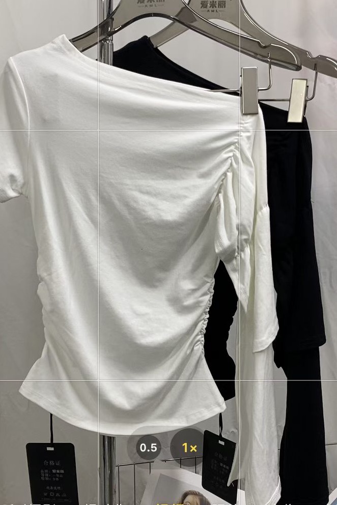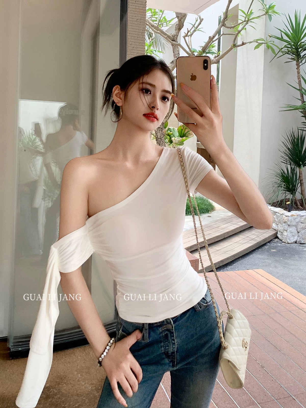 열세 개 여성 의류 아메리칸 고유 한 또한 아주 좋아. 비스듬한 어깨 반팔 티셔츠 여성 여름 섹션 몸매 가꾸기 슬림해 보이는 핫걸 맨위