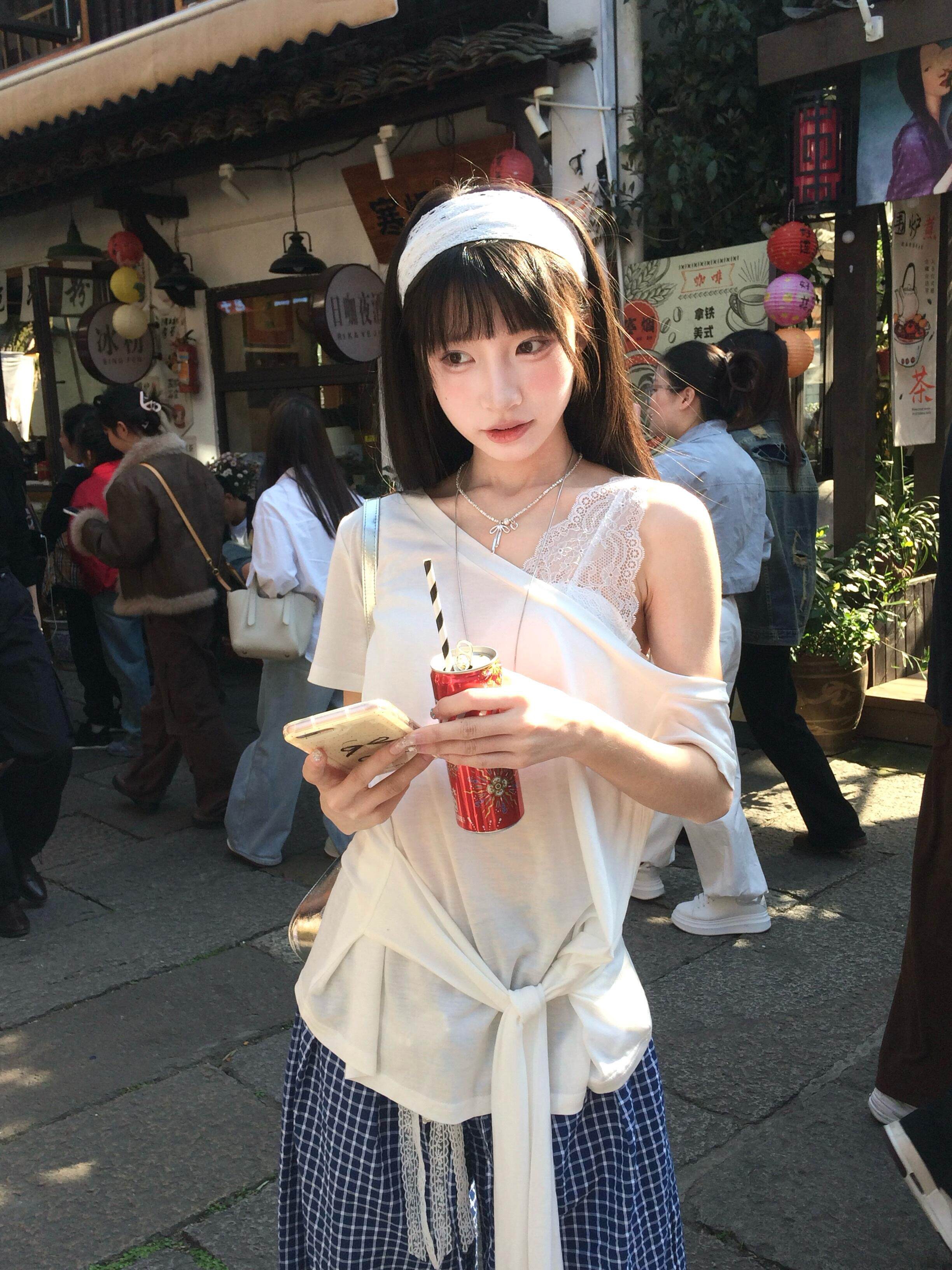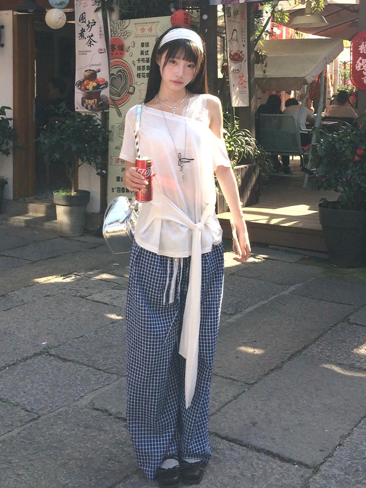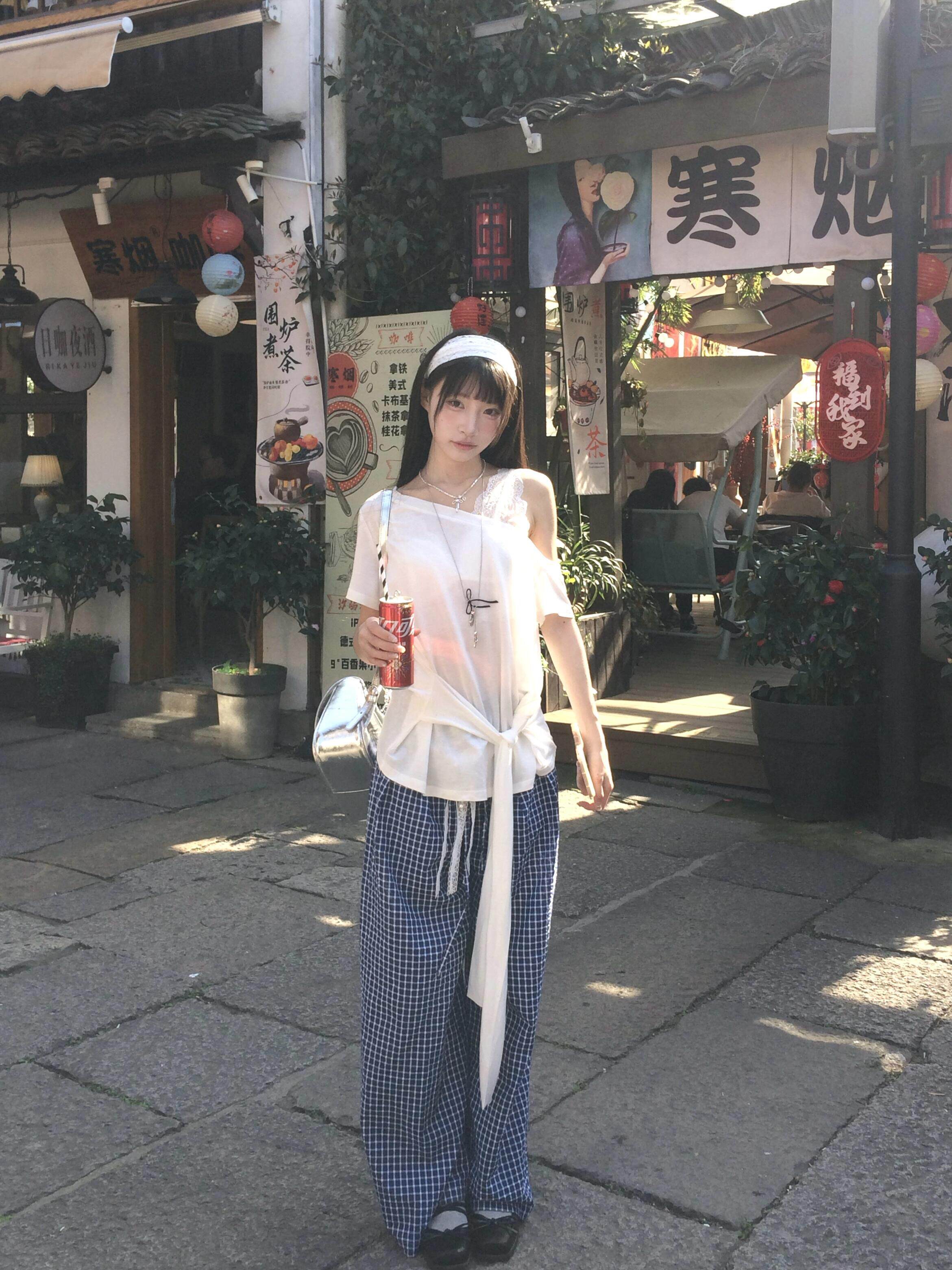 경관 그림 정가 체크무늬 V넥 캐미솔 새로운 달콤한 매운맛 바람 나비 매듭 허리 수축 몸매 가꾸기 슬림해 보이는 의류 ins