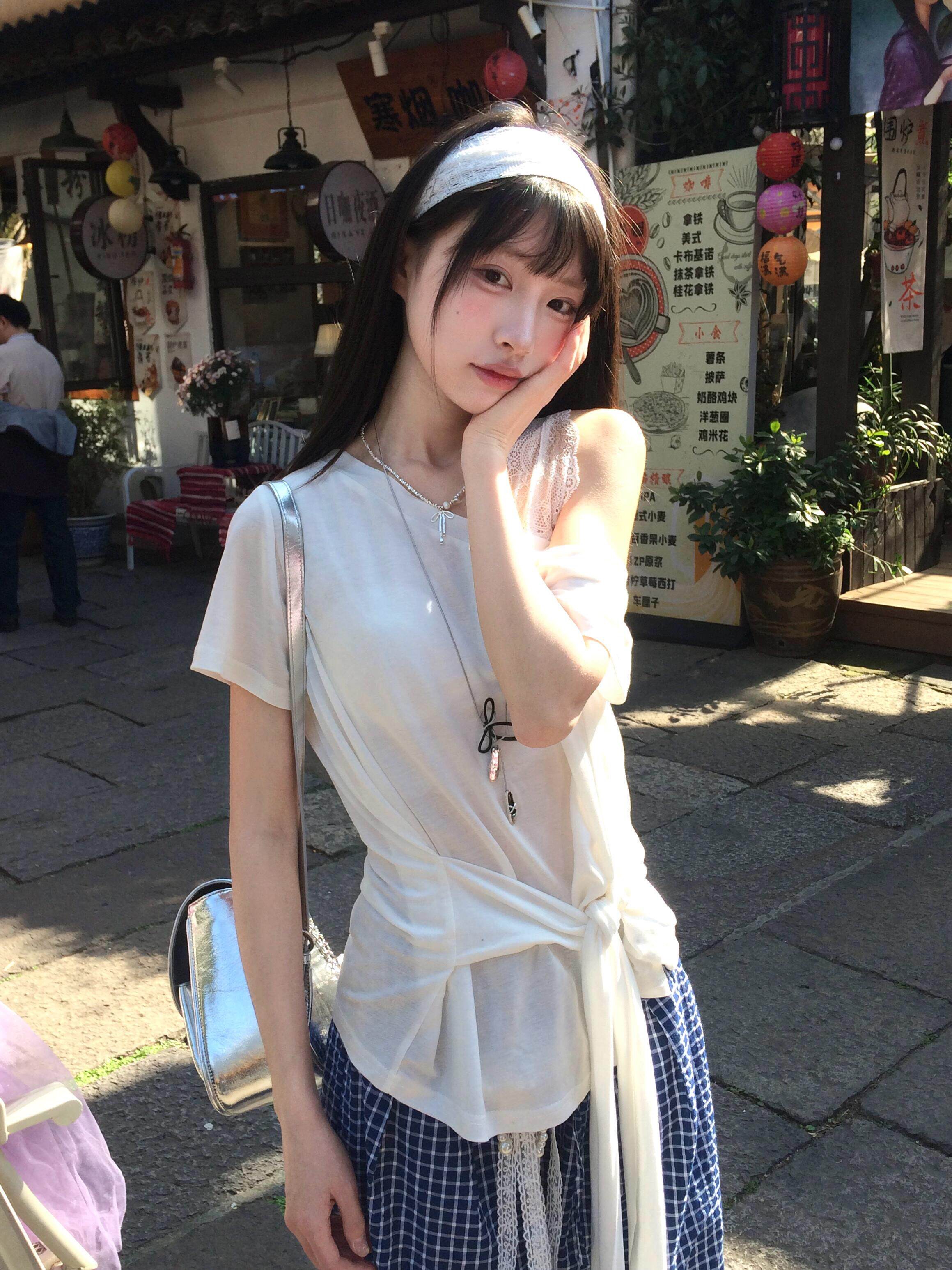원본 원단 한 부서 핫걸 비스듬한 어깨 디자인 센스 스트랩 반팔 티셔츠 여성 여름 새로운
