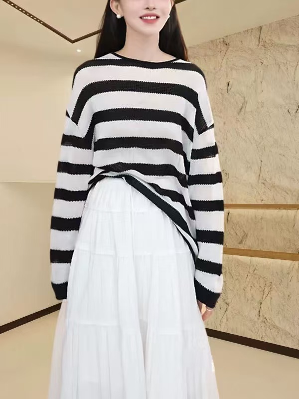 슈퍼 얇은 스타일 자외선 차단 맨위 여성 흑백 줄무늬 긴팔 티셔츠 여름 차가운 통기성 루즈핏 슬림해 보이는 니트 스웨터