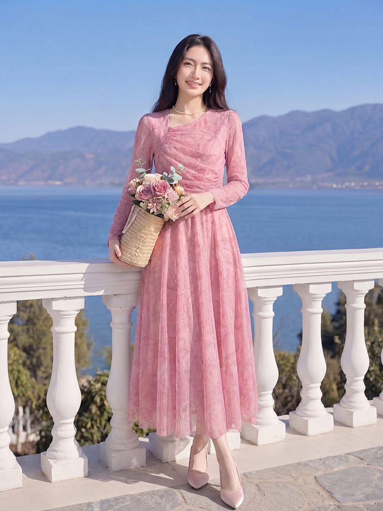 06 년 봄 여름 새로운 여성 프랑스식 우아함 품격 허리 수축 슬림해 보이는 핑크색 고급 센스 긴팔 드레스