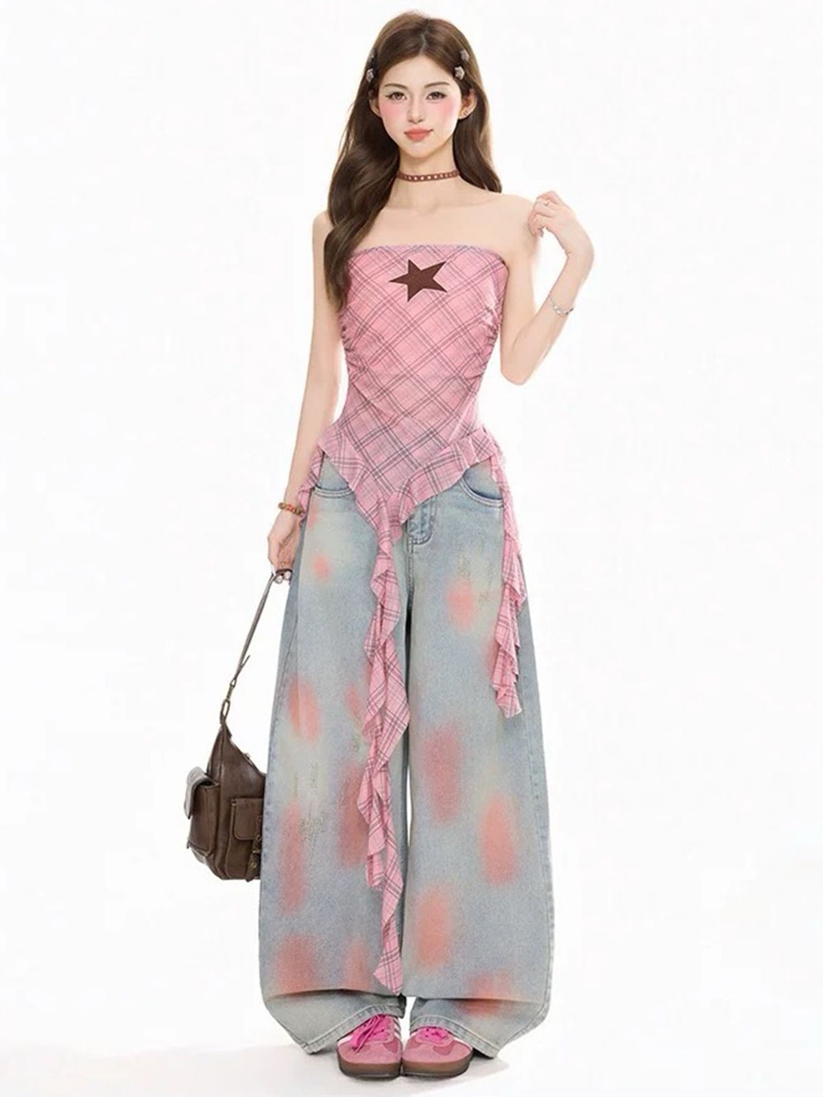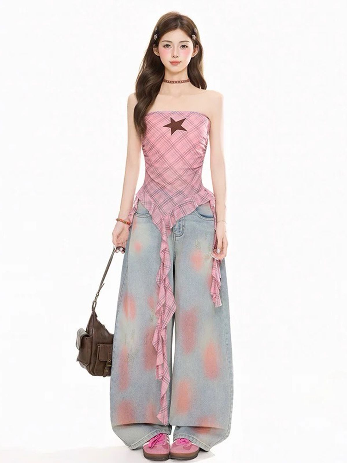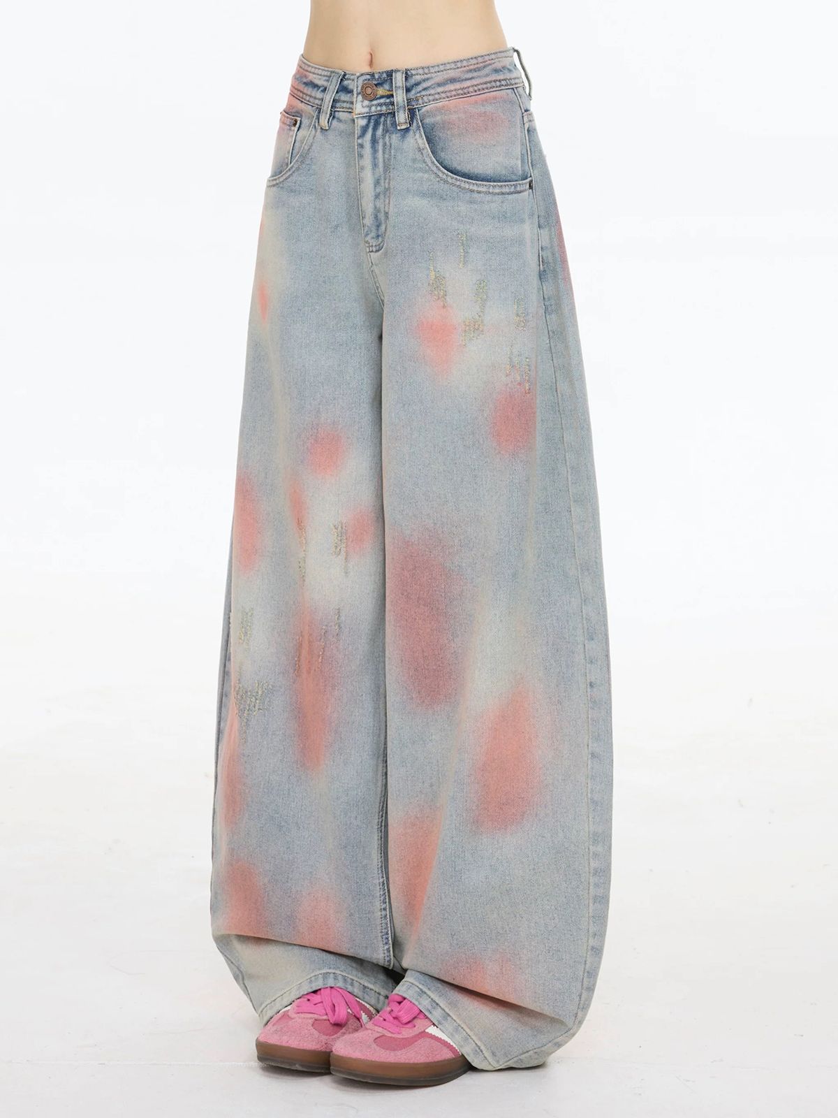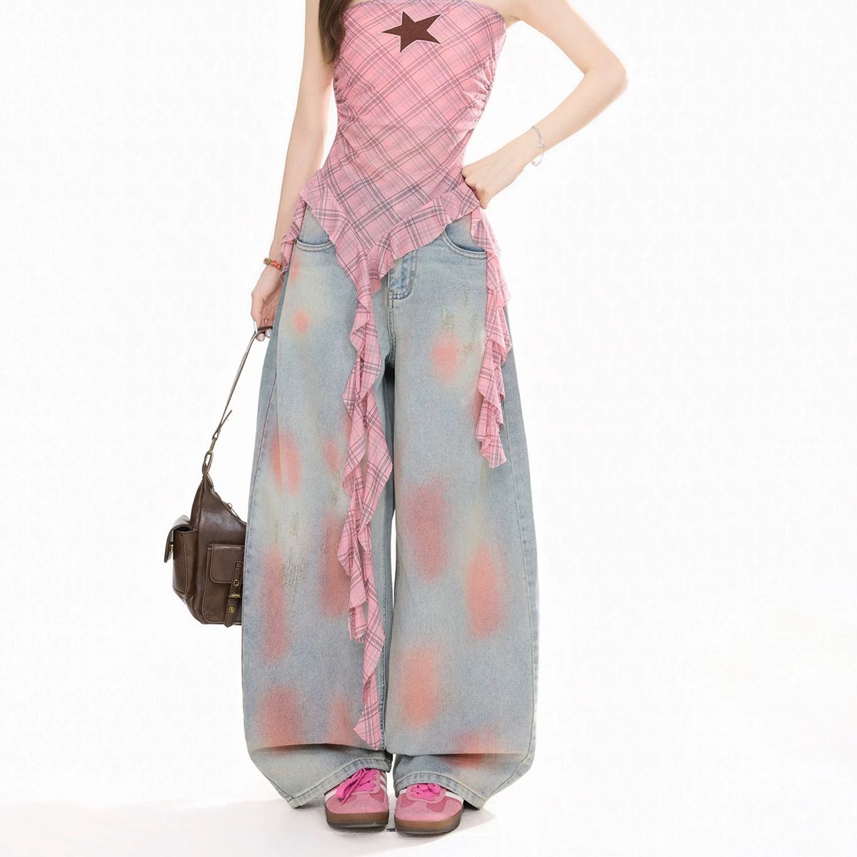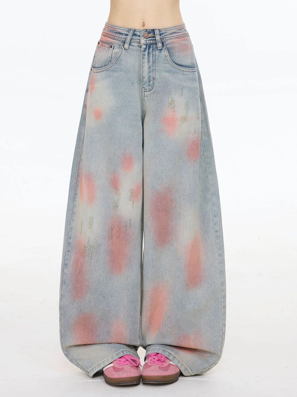 거리 더러운 염색 마 오래된 찢어진 부분 모통이 칼 청바지 바지 여자 2026 여름 새로운 작은 말 프린트 와이드 레그 팬츠