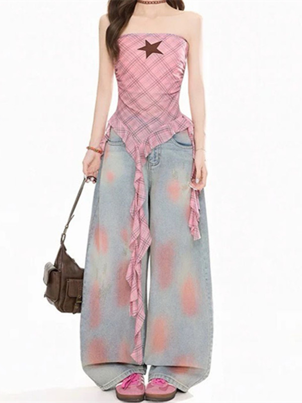 아메리칸 핫걸 낙서 알파벳 프린트 더블 허리 가져 가라. 조각 페이크 레이어드 청바지 여성 봄 가을 디자인 센스 와이드 레그 팬츠 트렌디