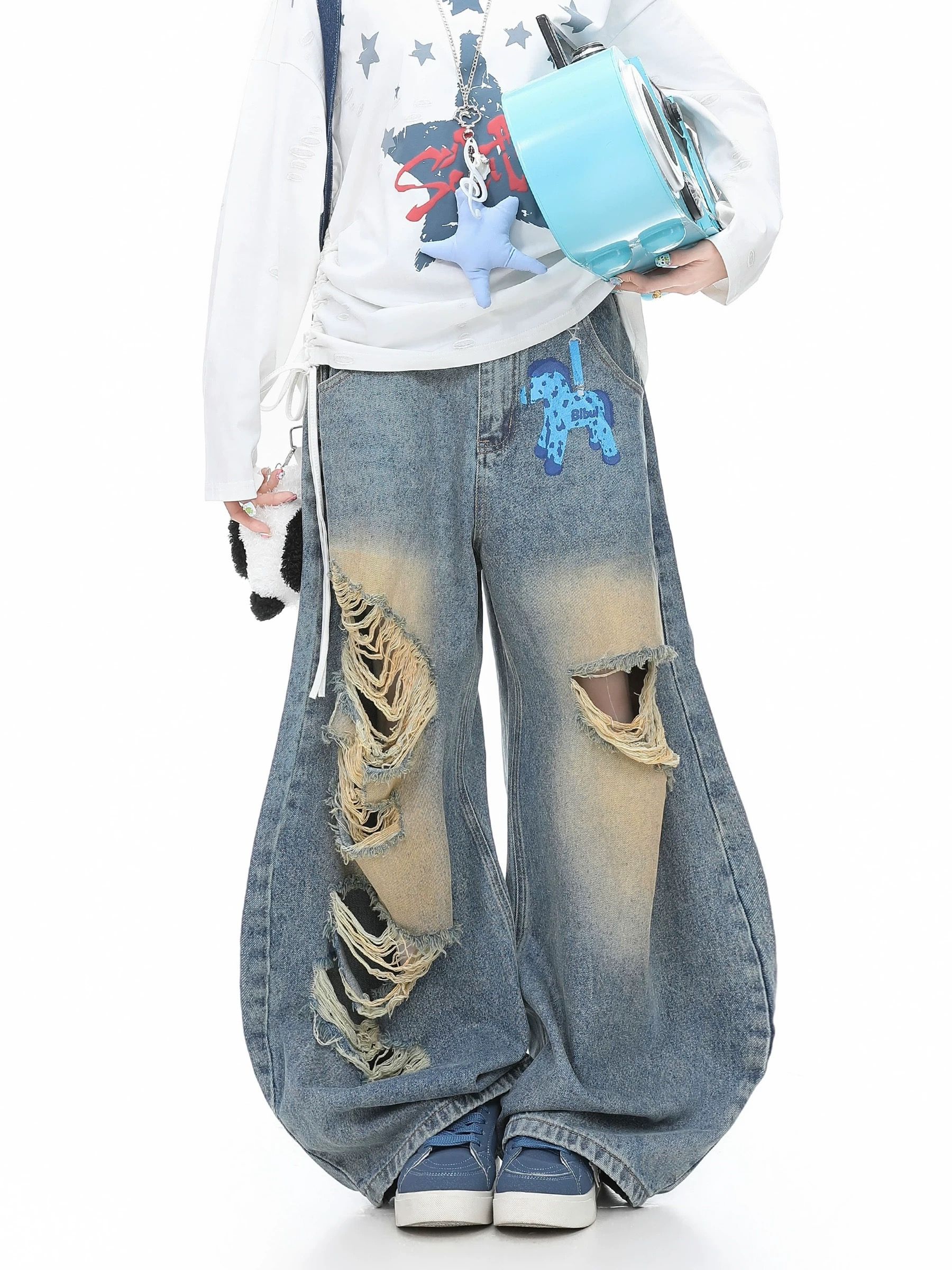 거리 더러운 염색 마 오래된 찢어진 부분 모통이 칼 청바지 바지 여자 2026 여름 새로운 작은 말 프린트 와이드 레그 팬츠