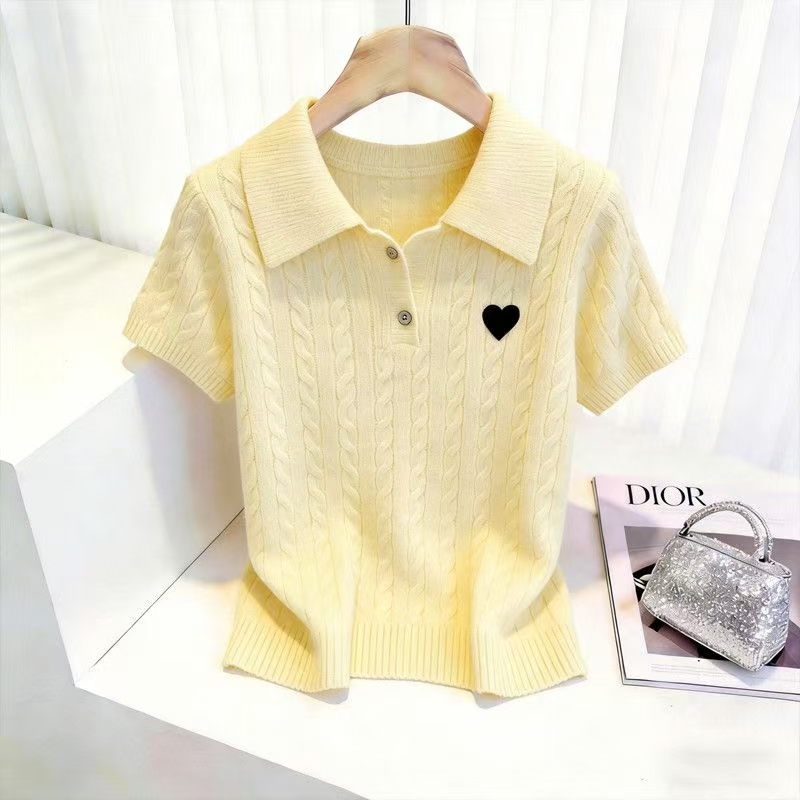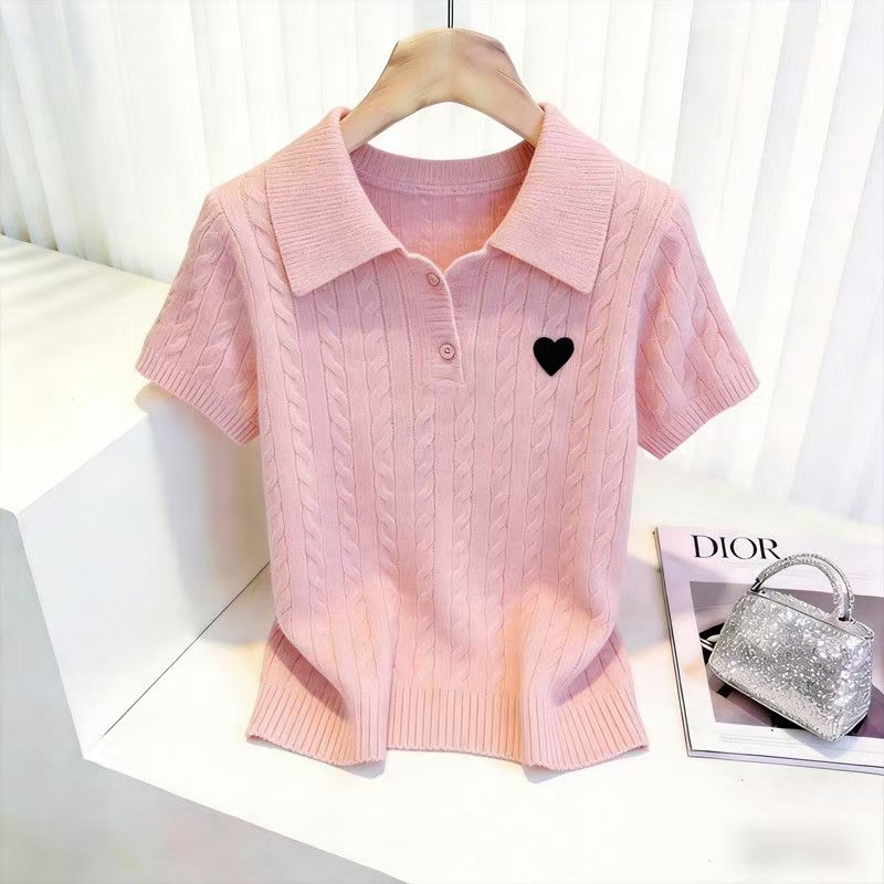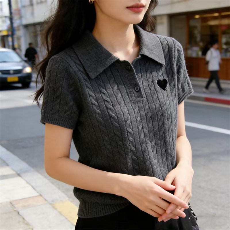 새로운 2026 여름 회색 POLO 칼라 마 무늬 반팔 니트 스웨터 하트 자수 맨위 여성