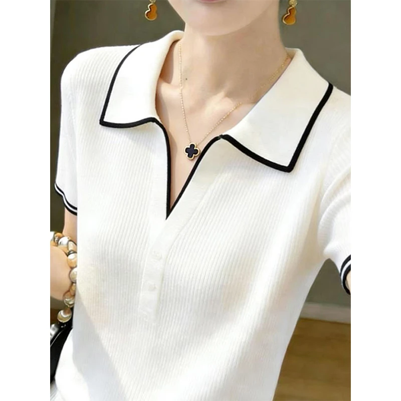 여름 새로운 배색 POLO 칼라 얇은 스타일 반팔 니트 스웨터 여성 슬림해 보이는 패션 다용도 폴로 칼라 맨위 티셔츠 트렌디