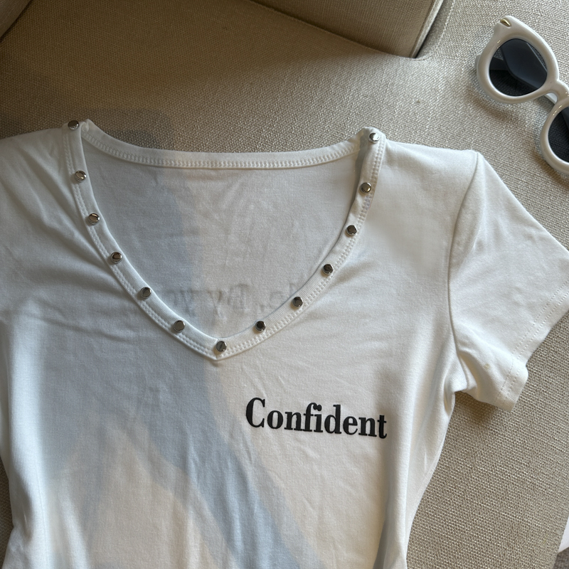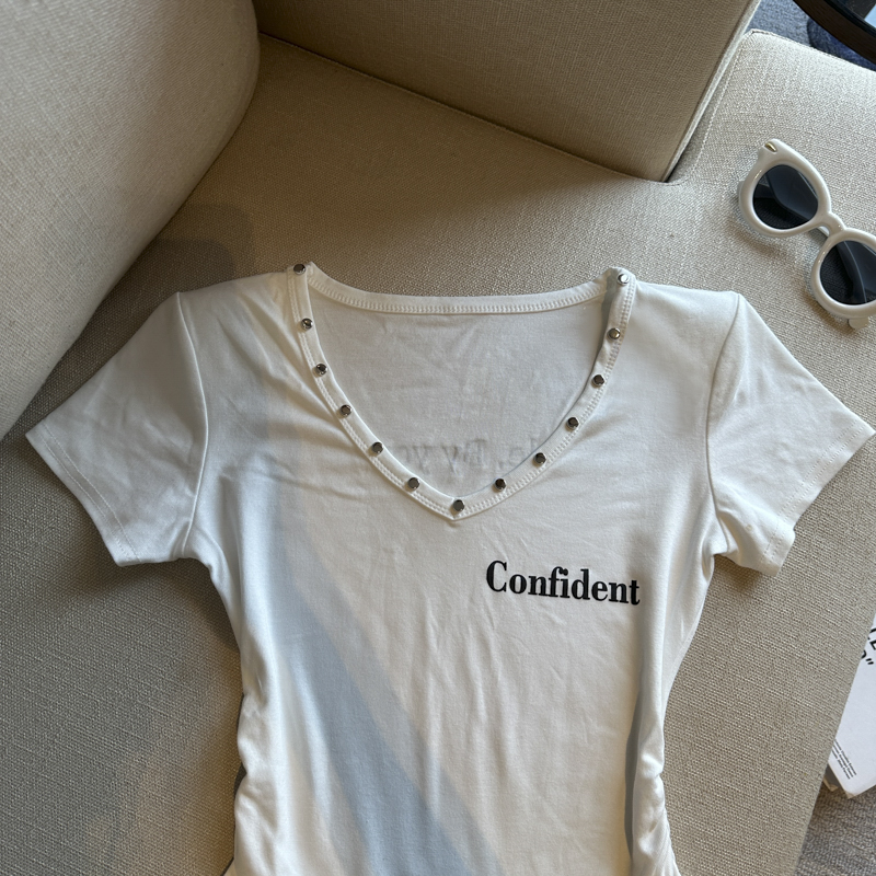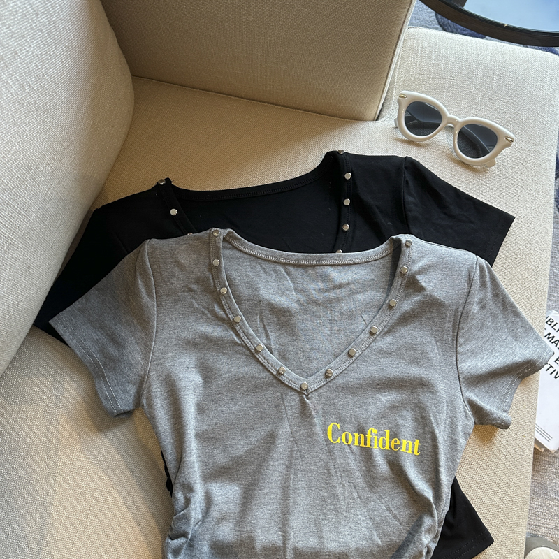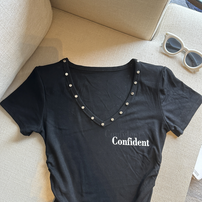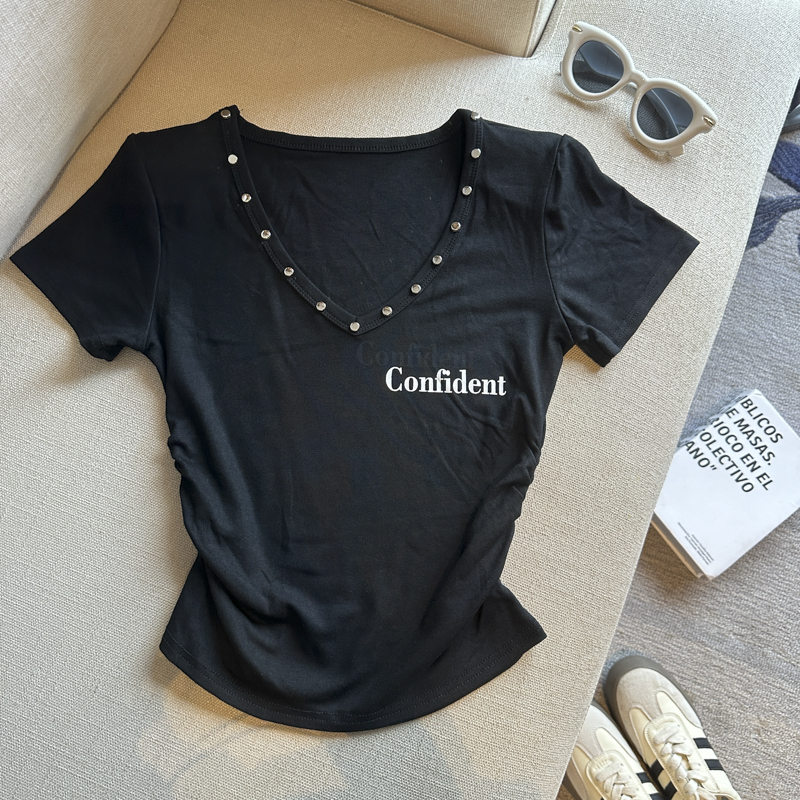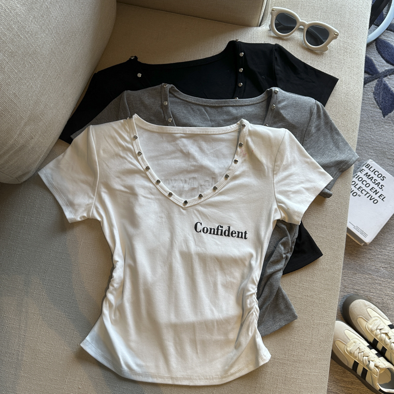 실사 한 부서 심장 기계 순수한 욕망 바람 V넥 징 주름 신축성 슬림해 보이는 다용도 세련된 알파벳 반팔 티셔츠