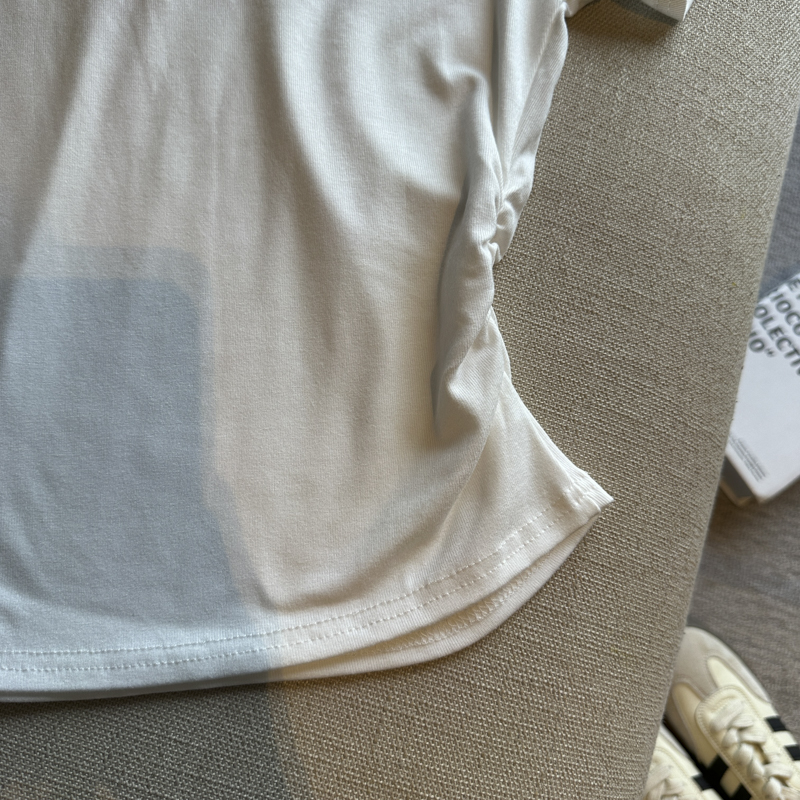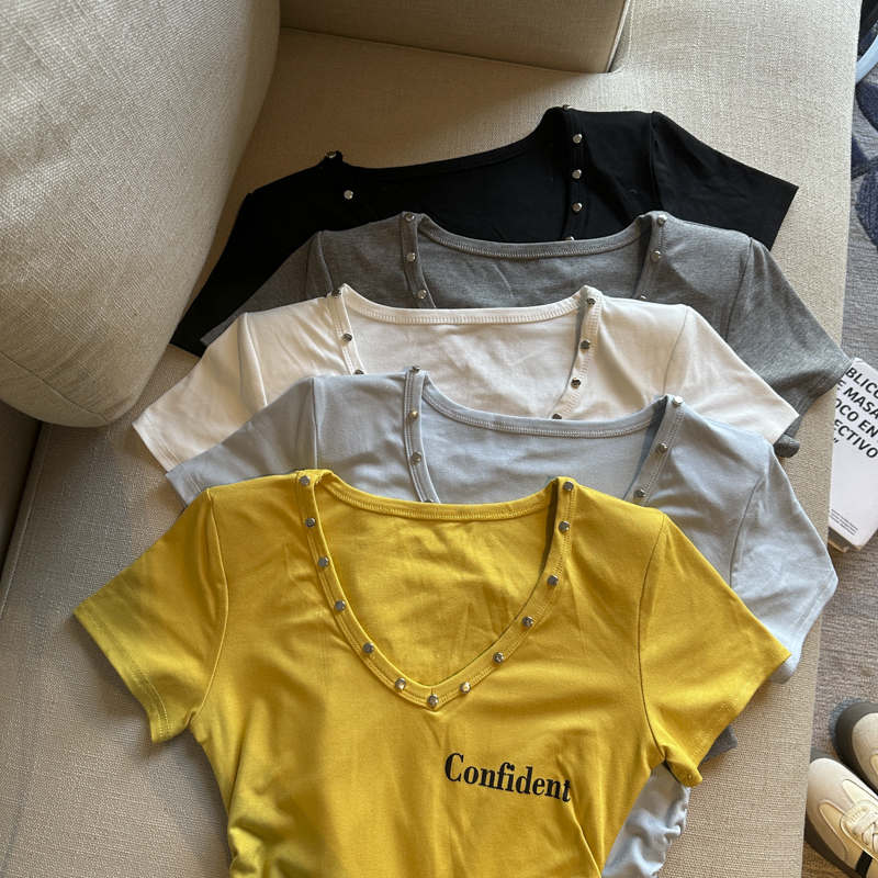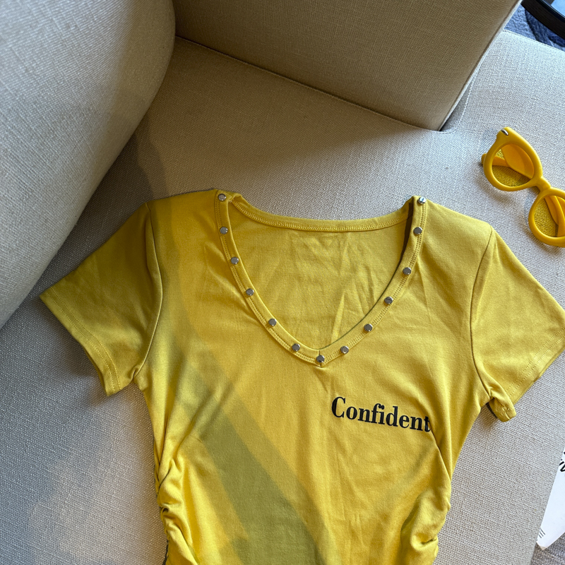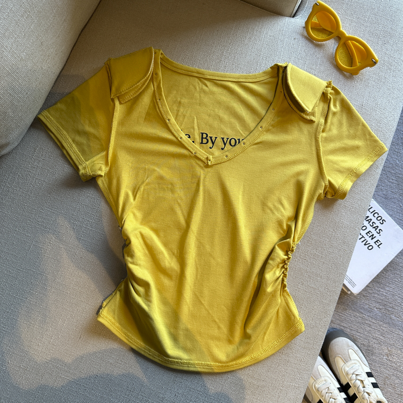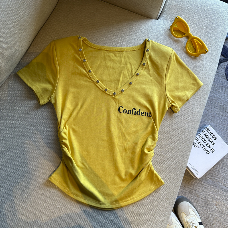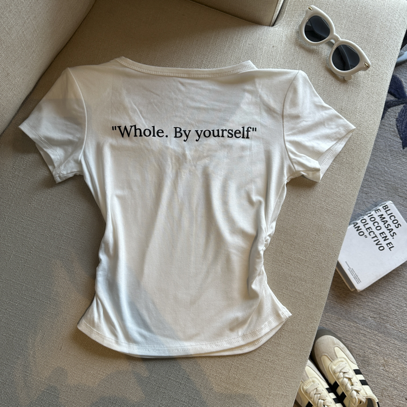 실사 한 부서 심장 기계 순수한 욕망 바람 V넥 징 주름 신축성 슬림해 보이는 다용도 세련된 알파벳 반팔 티셔츠