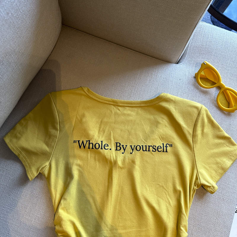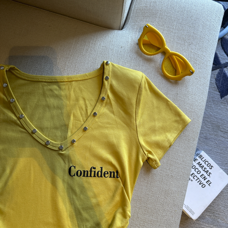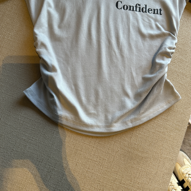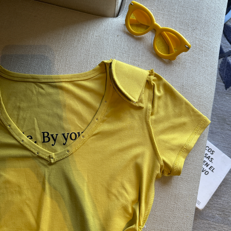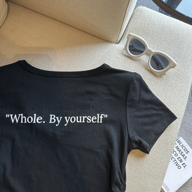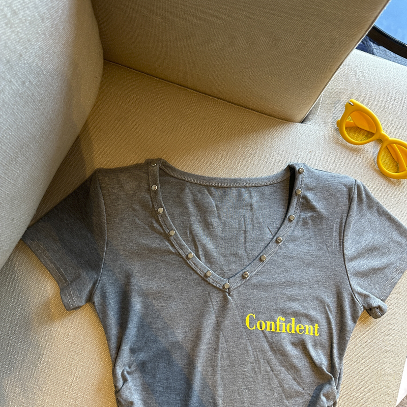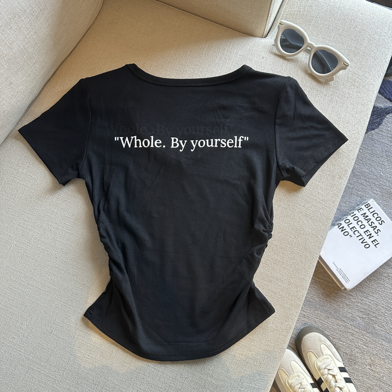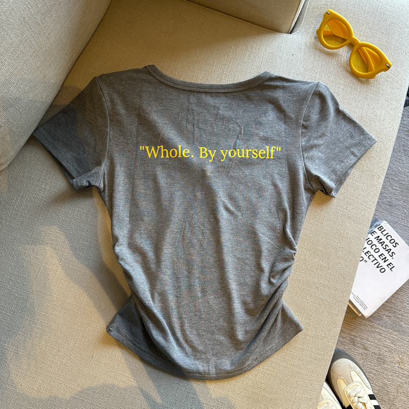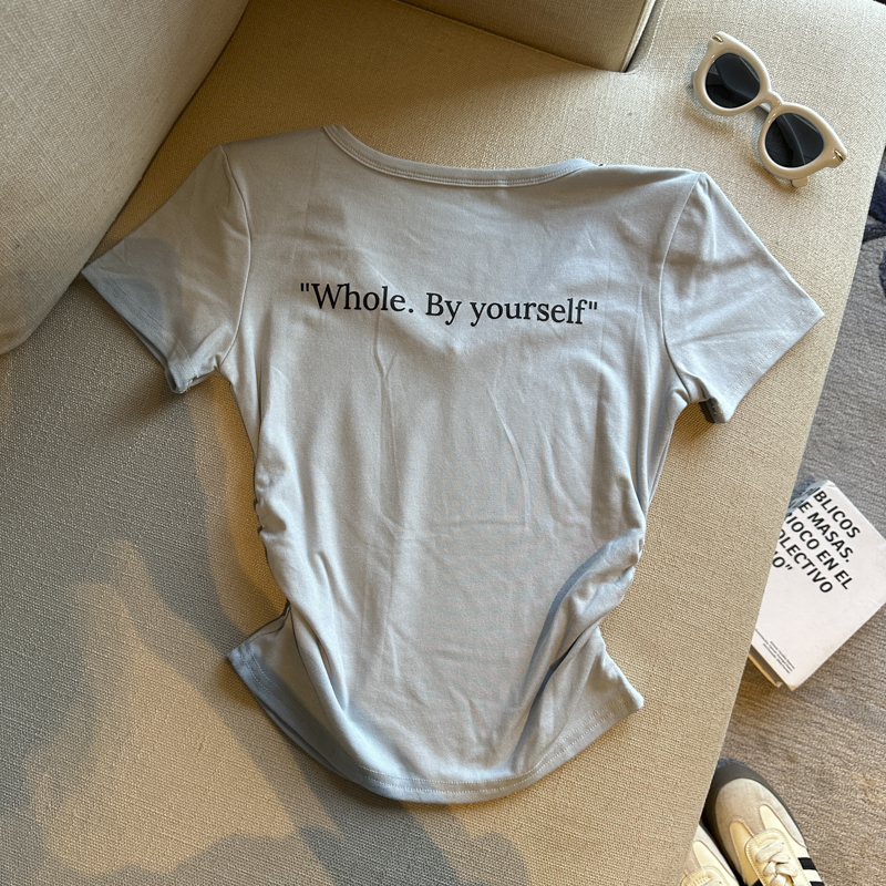 실사 한 부서 달콤한 매운맛 핫걸 바람 알파벳 프린트 u 칼라 디자인 센스 신축성 슬림해 보이는 세련된 Chic 티셔츠