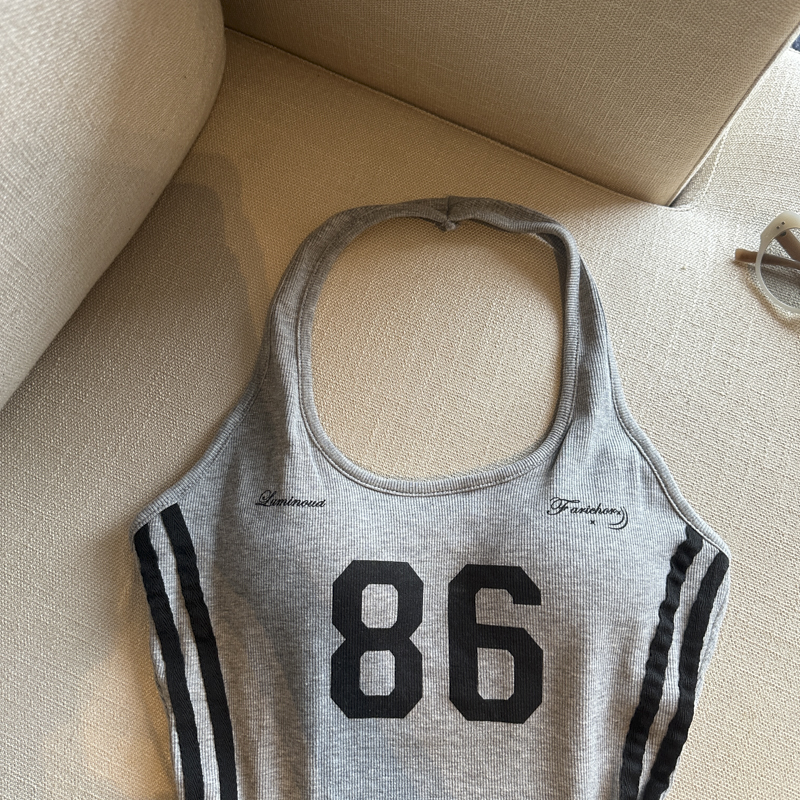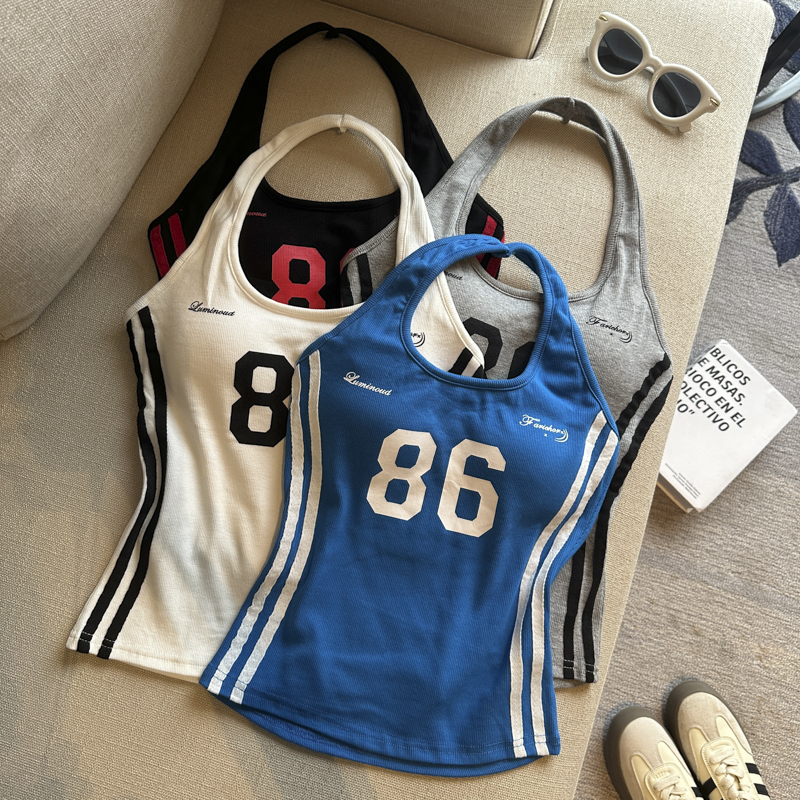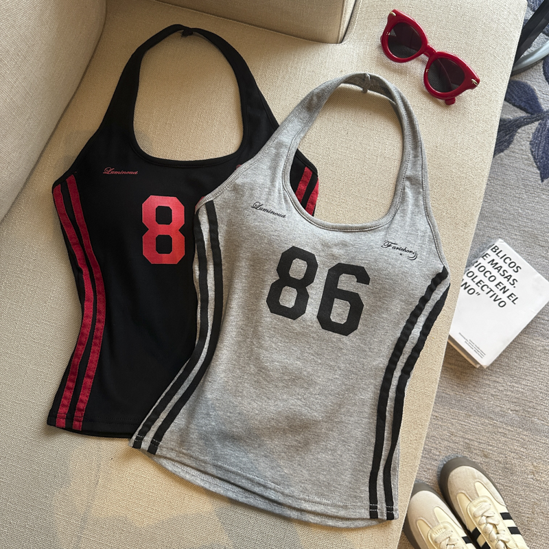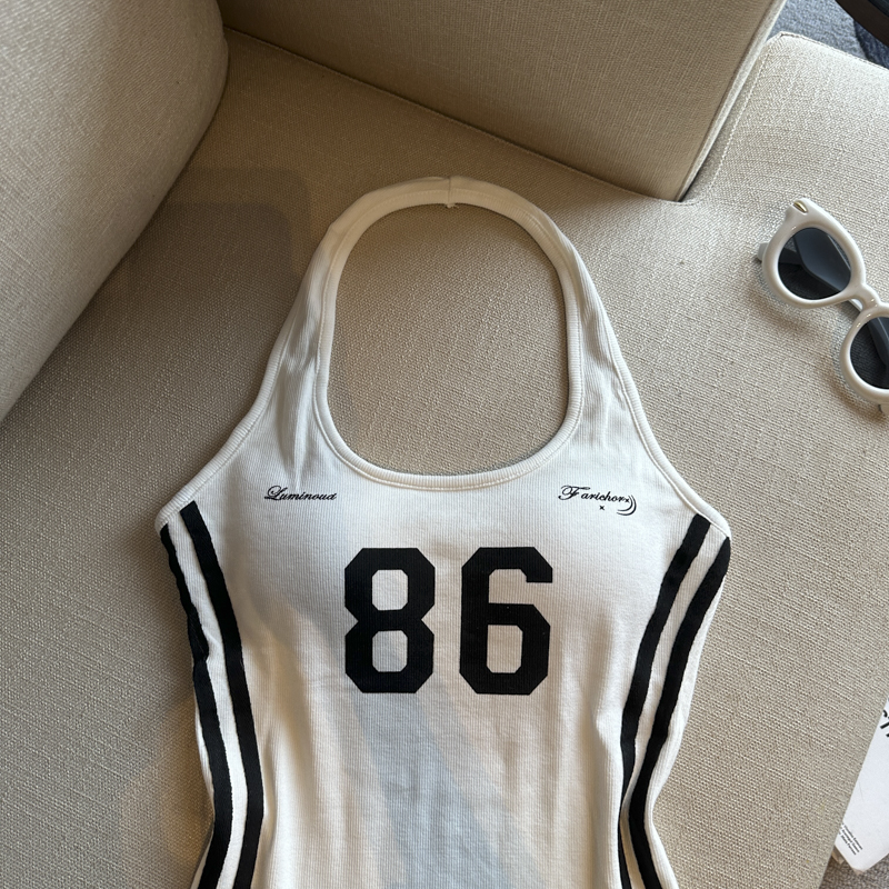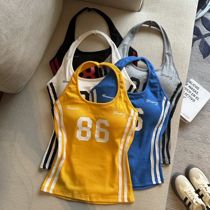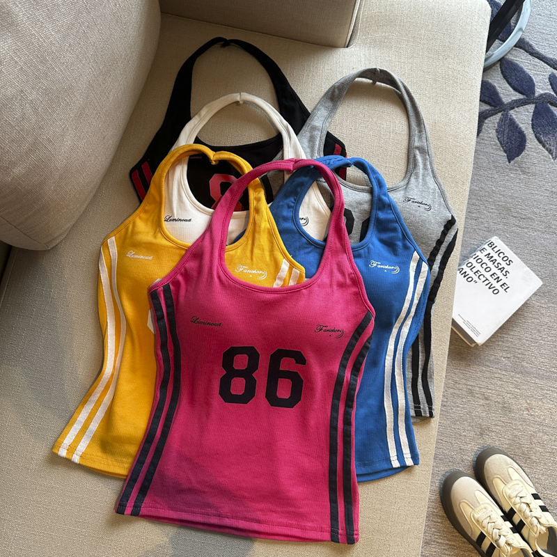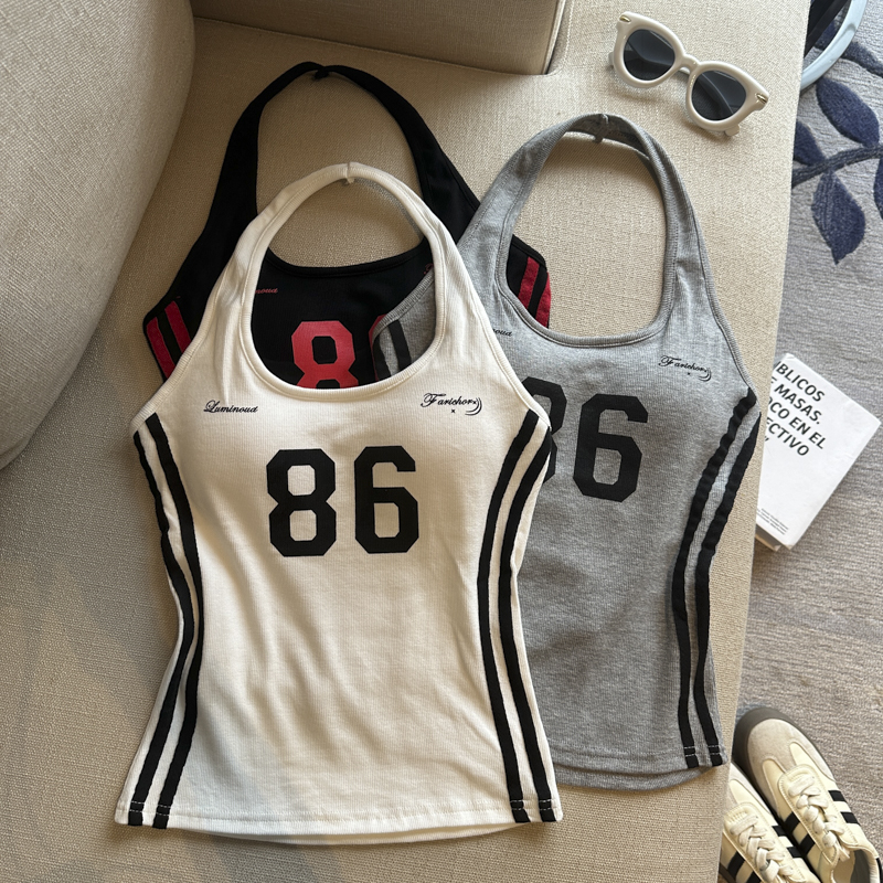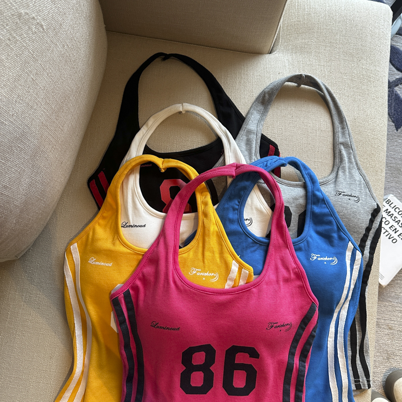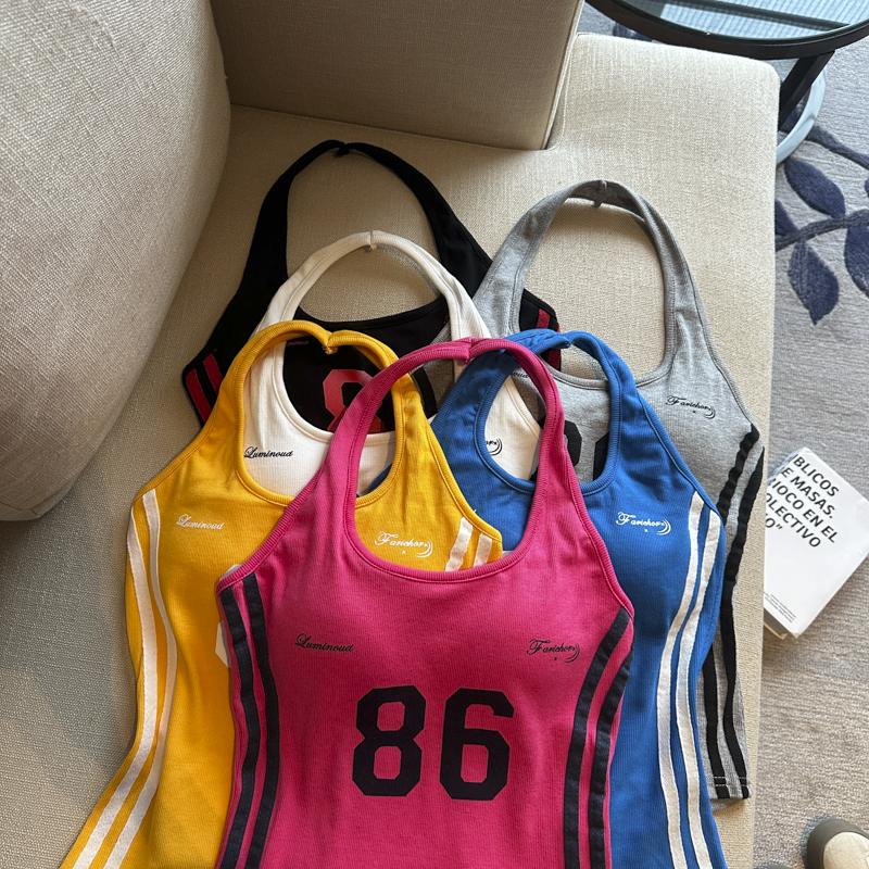 실사 핫걸 알파벳 프린트 캐미솔 여름 외출용 벨트 가슴 패드 행침 목 몸매 가꾸기 아름다움 뒤쪽에 의류