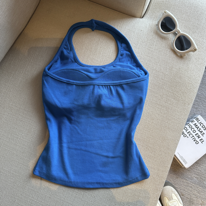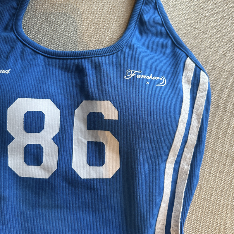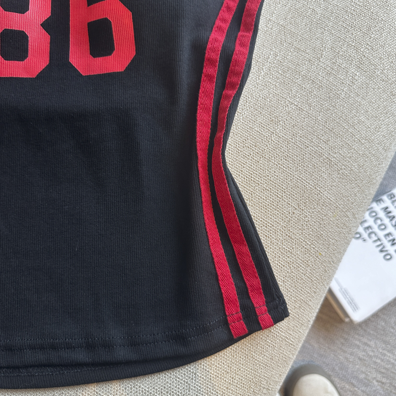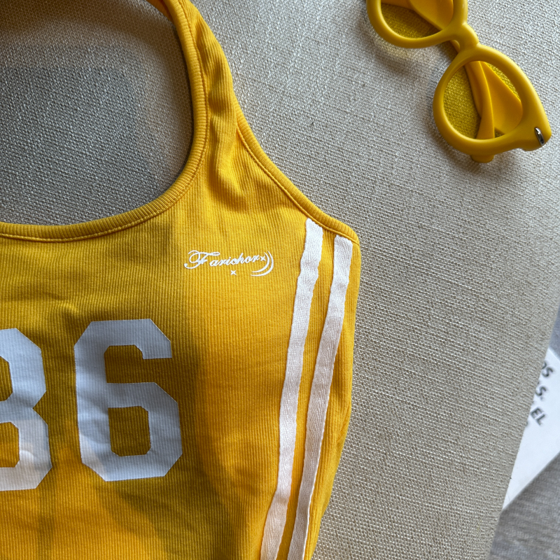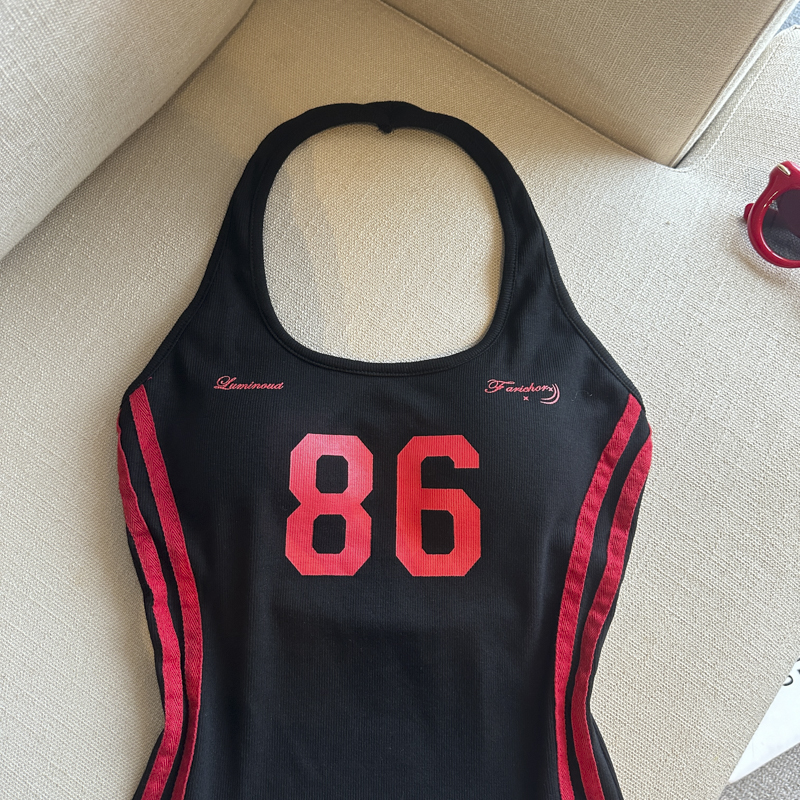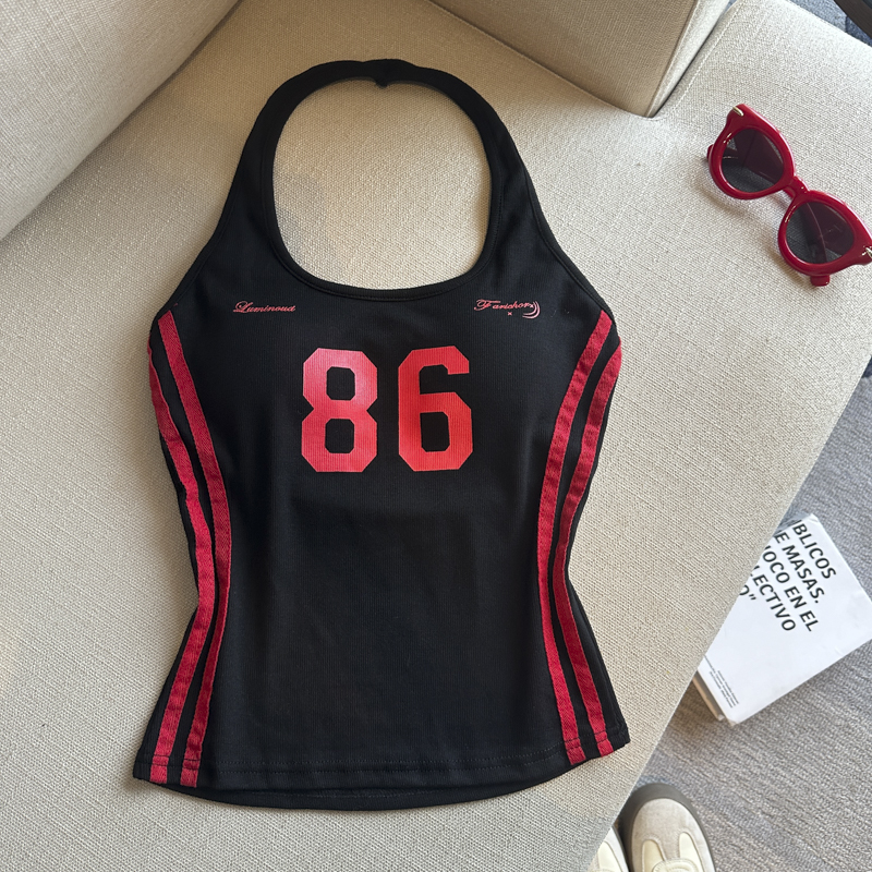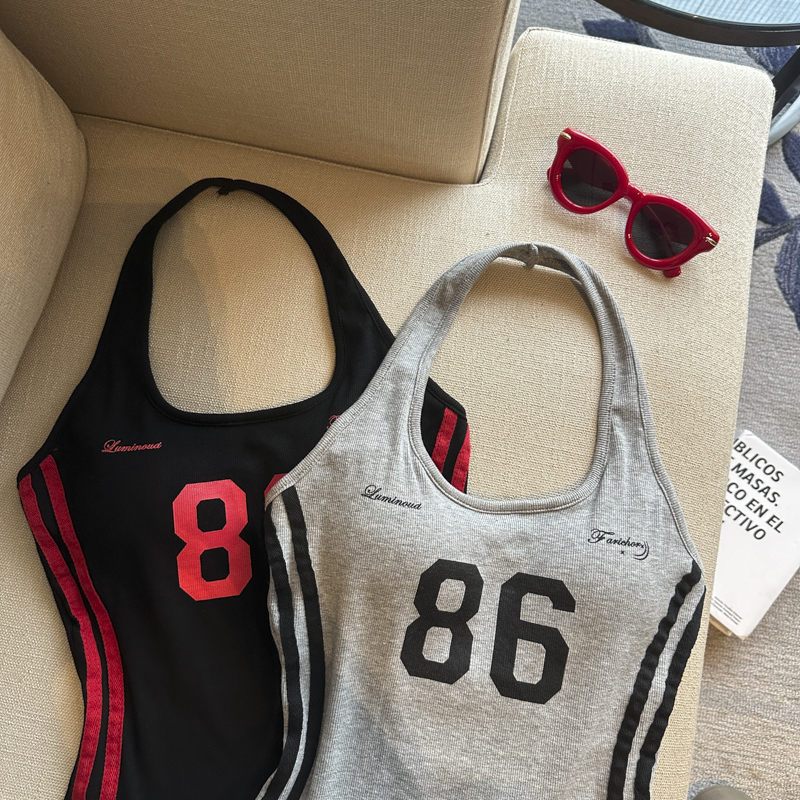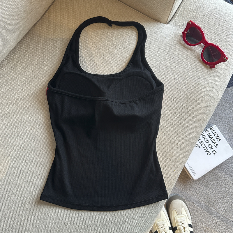 실사 핫걸 알파벳 프린트 캐미솔 여름 외출용 벨트 가슴 패드 행침 목 몸매 가꾸기 아름다움 뒤쪽에 의류