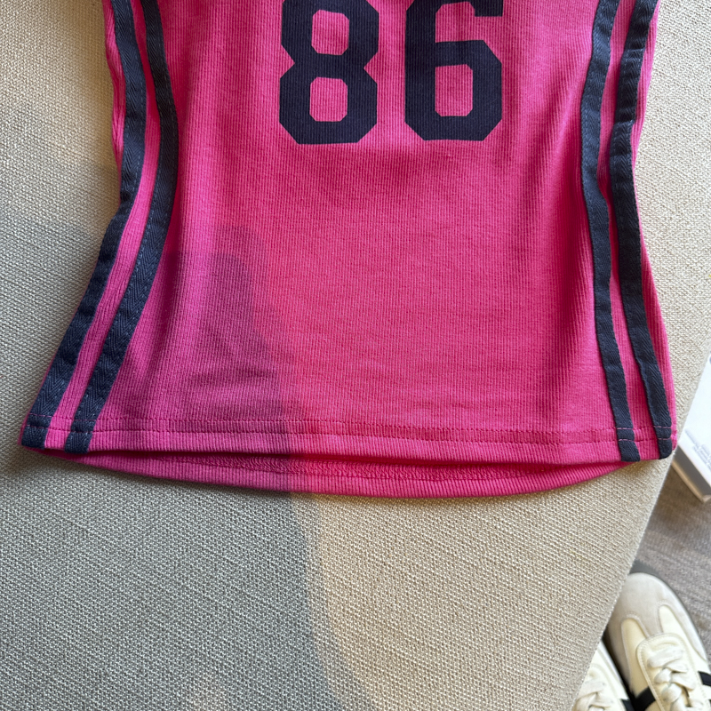 실사 2026 여름 새로운 순수한 욕망 백리스 반팔 어깨 패드 티셔츠 여성 여름 알파벳 프린트 핫걸 맨위 트렌디