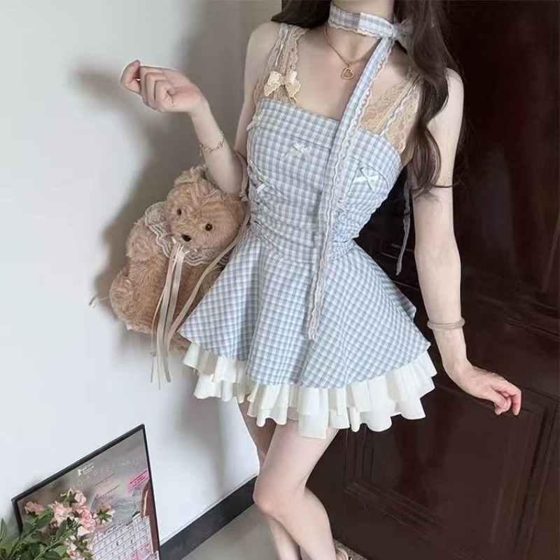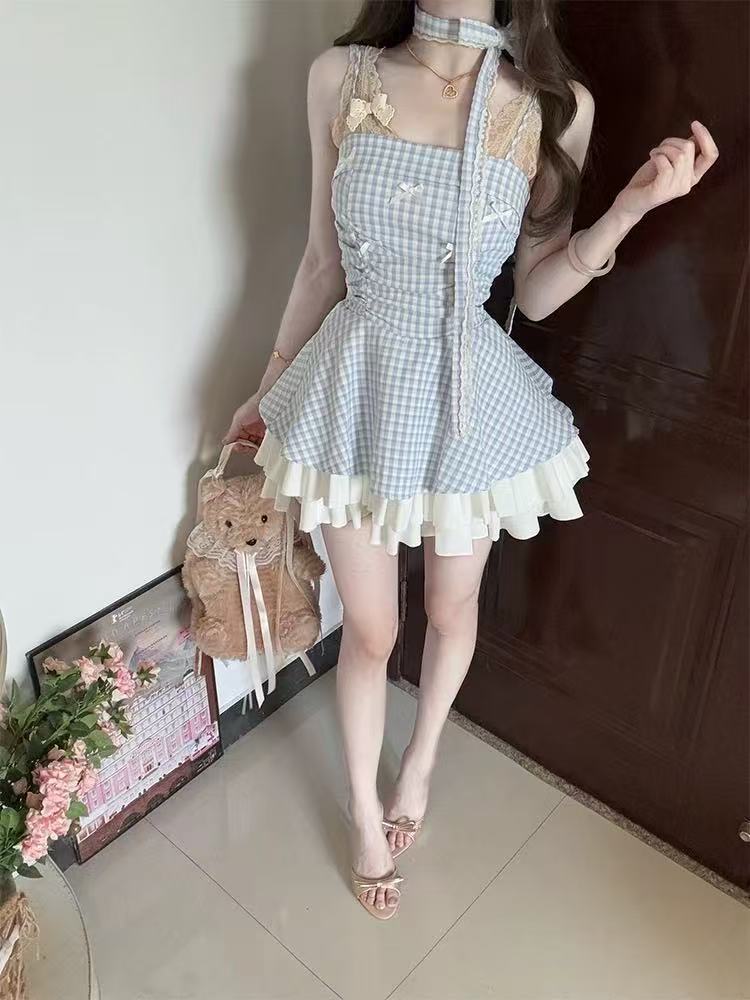 2026 여름 달콤함 한국 스타일 바람 섹시함 나비 매듭 슬립 여성 드레스 하이웨이스트 슬림해 보이는 체크무늬 퍼프 미니 스커트