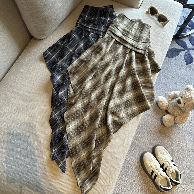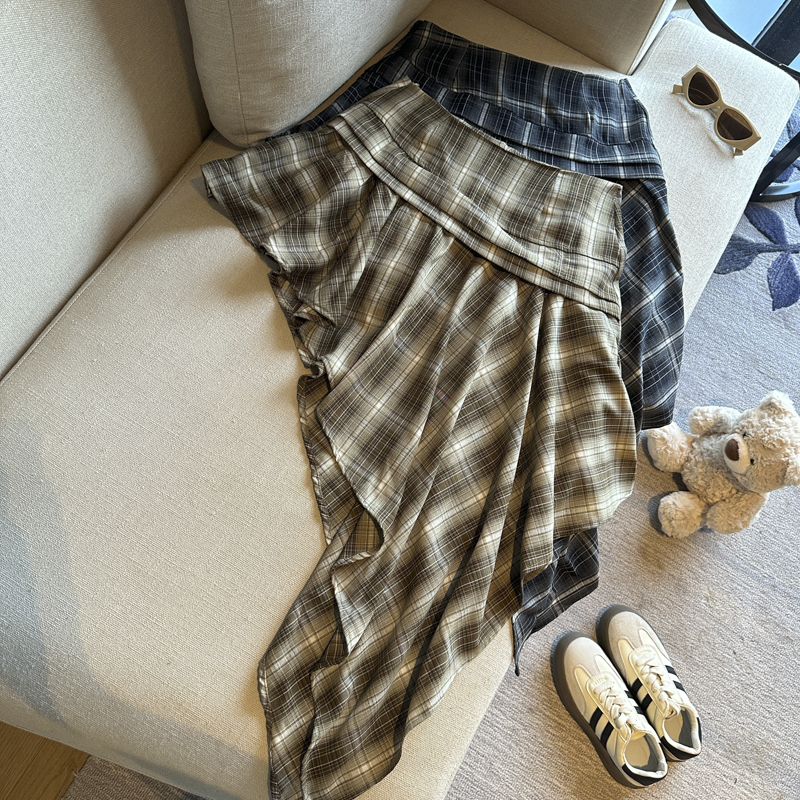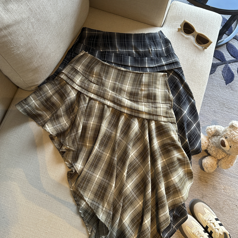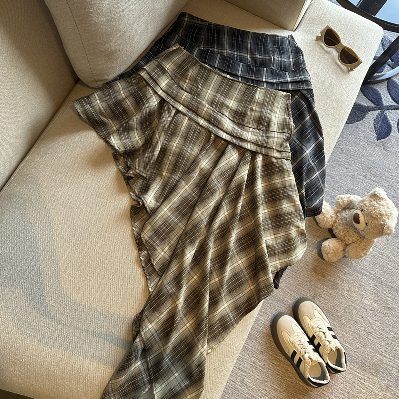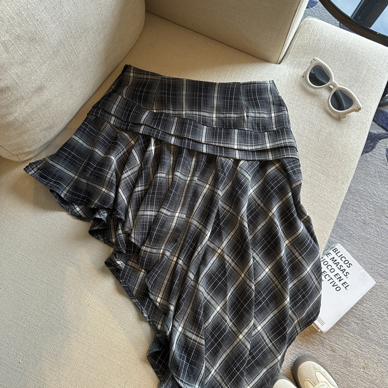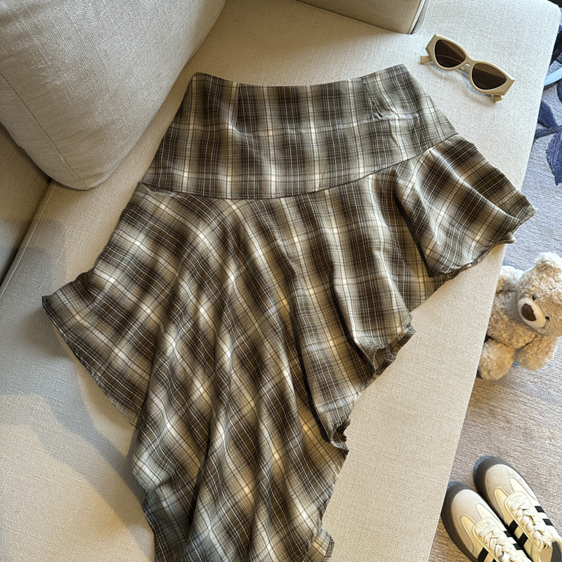 실사 레트로 체크무늬 불규칙 반신 스커트 여성 여름 하이웨이스트 핫걸 슬림해 보이는 타이트 스커트 한 마디 프릴 미니 스커트