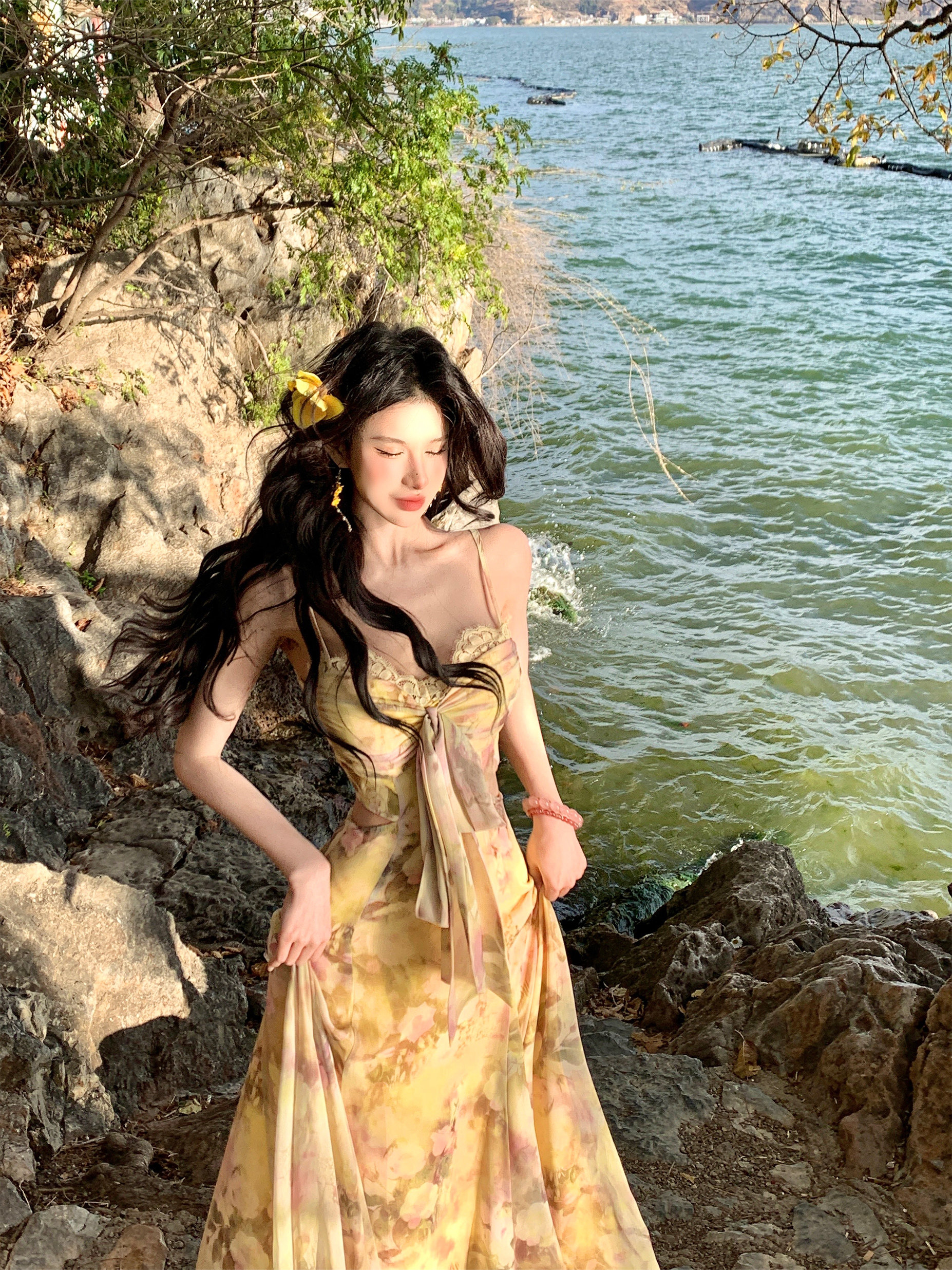 아름다운 해변가 휴가 해변 드레스 여성 여름 꽃무늬 롱 스커트 품격 고급 센스 프랑스식 슬립 허리 수축 드레스