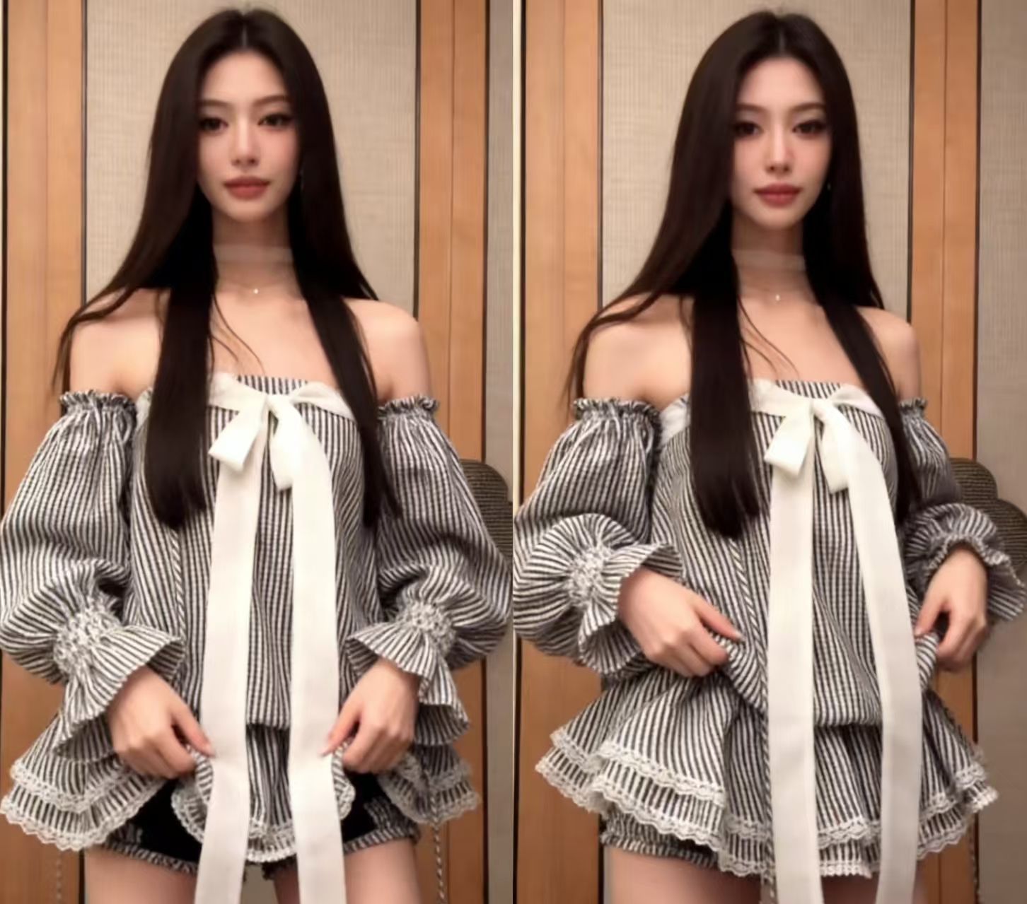 오프숄더 나비 매듭 스트라이프 튜브탑 여성 드레스 여름 프랑스식 품격 허리 수축 자이언트 잘 생긴 케이크 짧은 치마