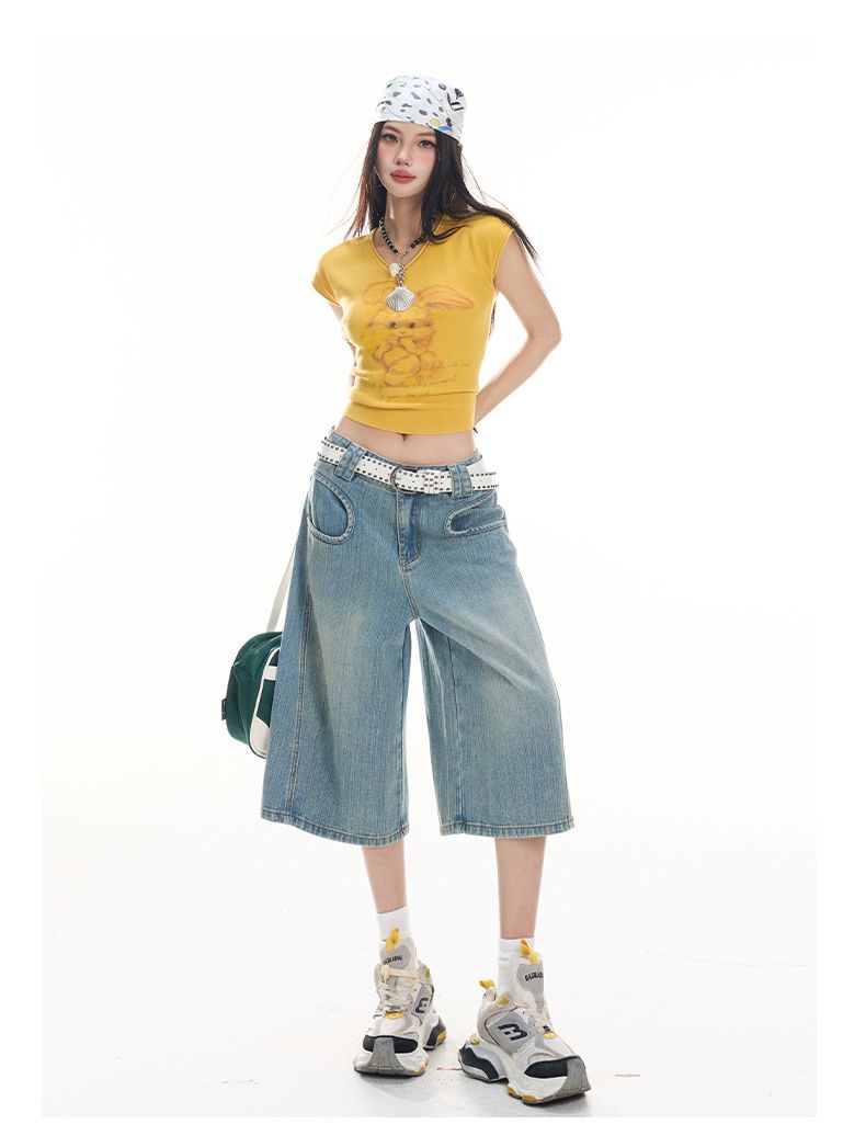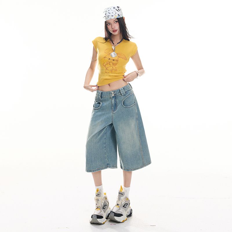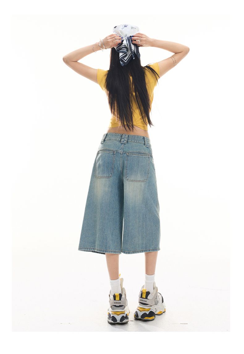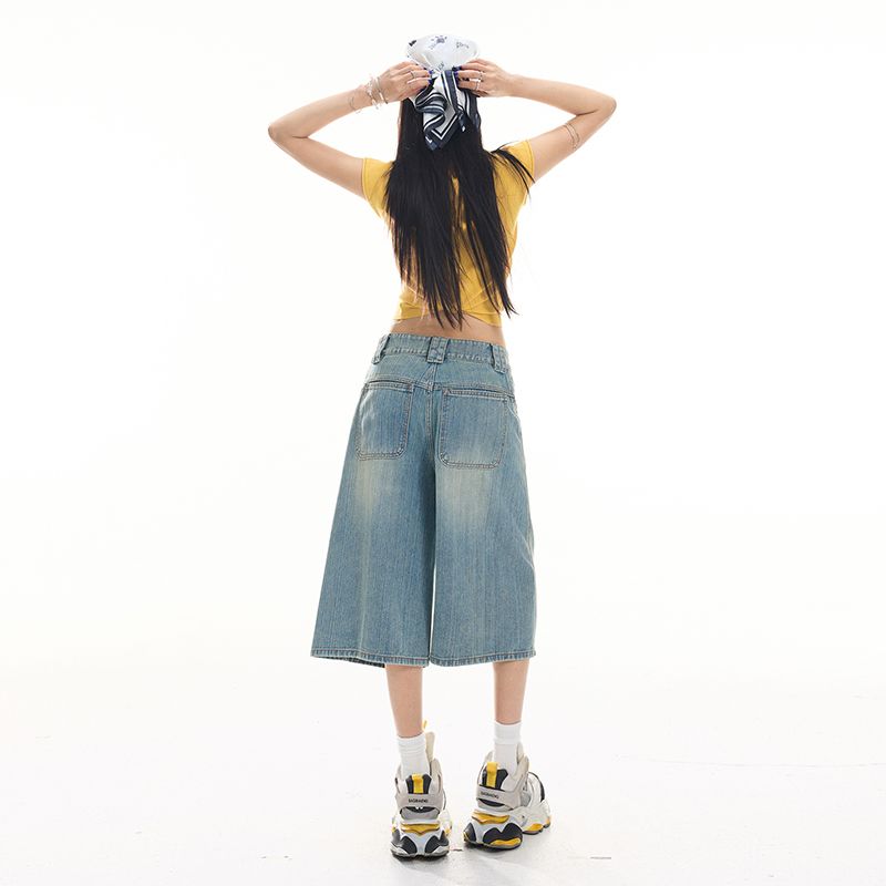아메리칸 레트로 루즈핏 느슨함 센스 넓은 다리 5 점 청바지 여성