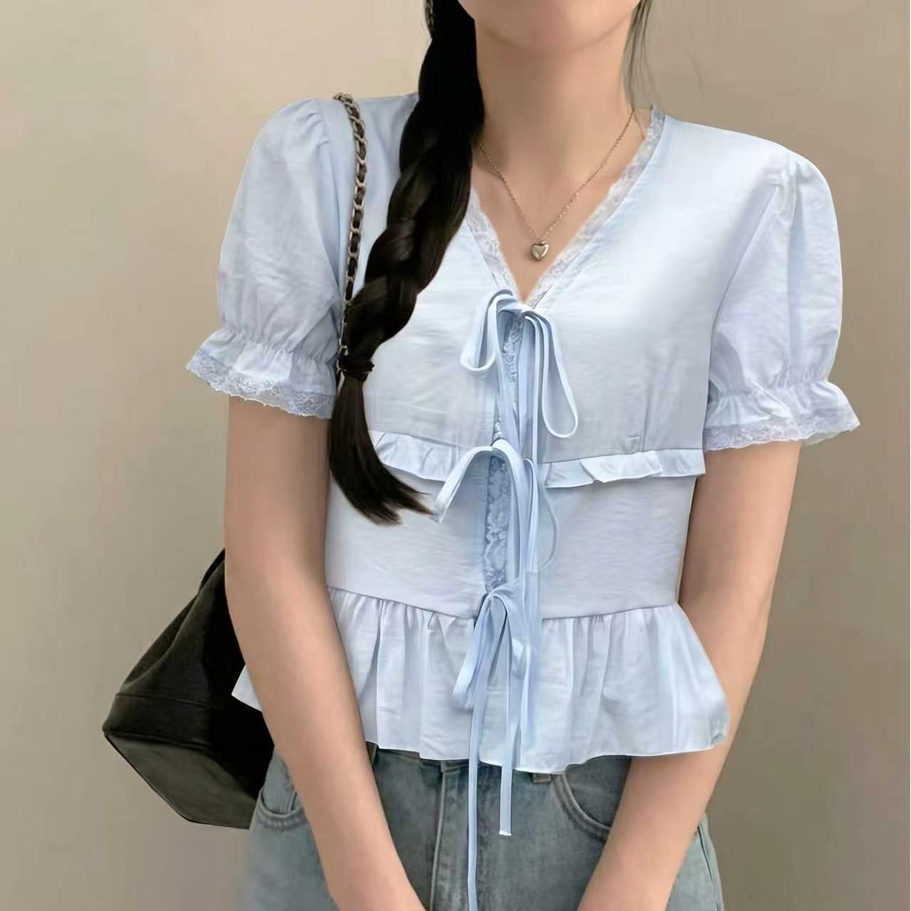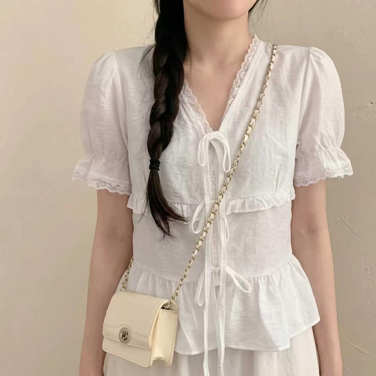 chic 2026 새로운 여름 고유 한 아름다운 슬림해 보이는 맨위 레이스 V넥 반팔 여성 셔츠