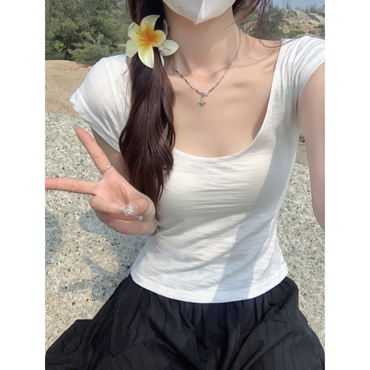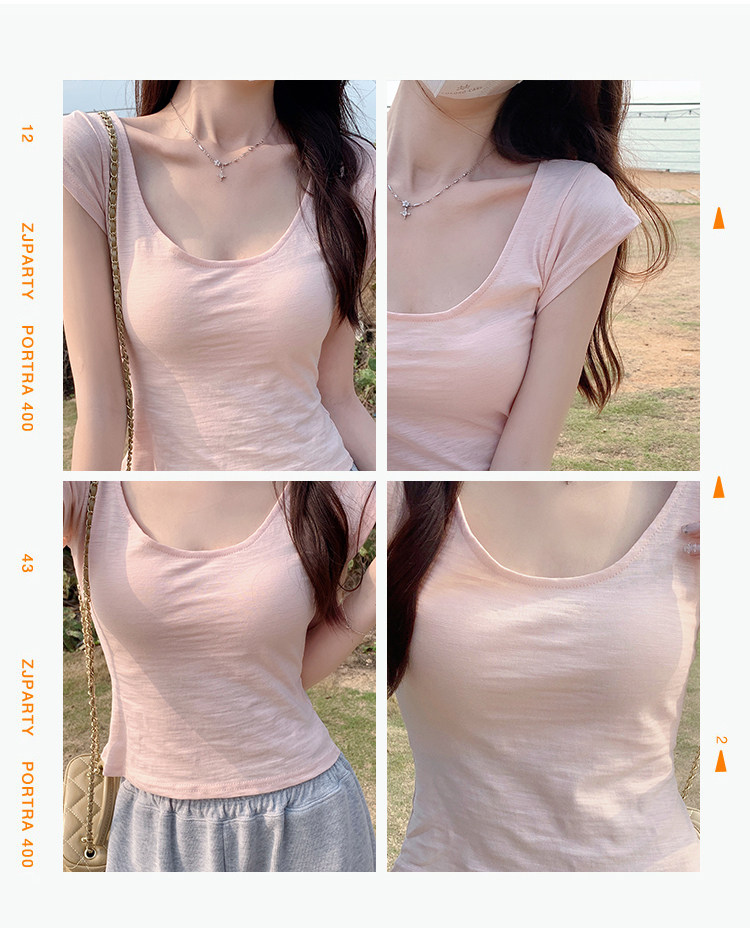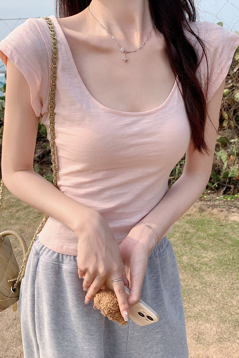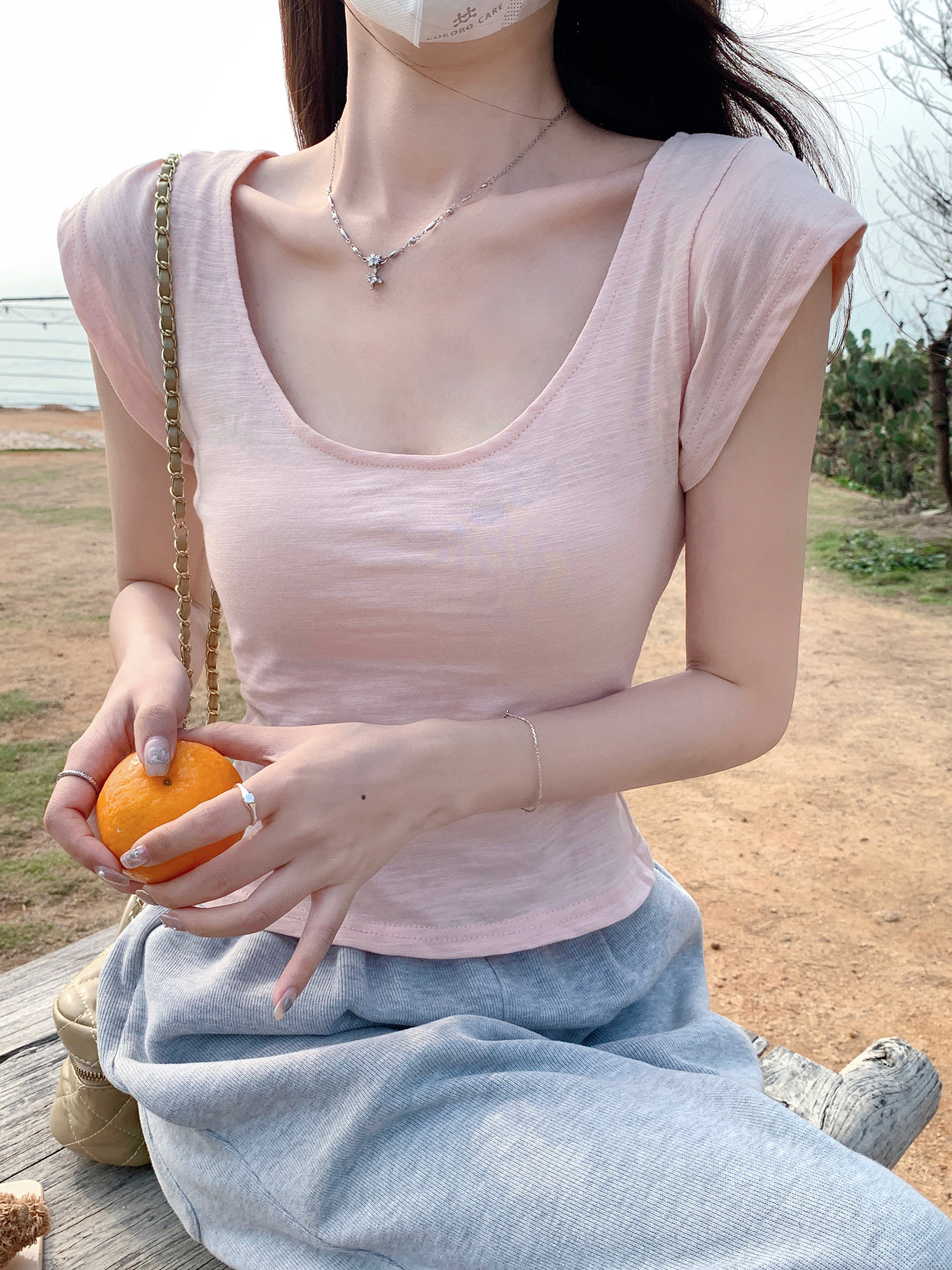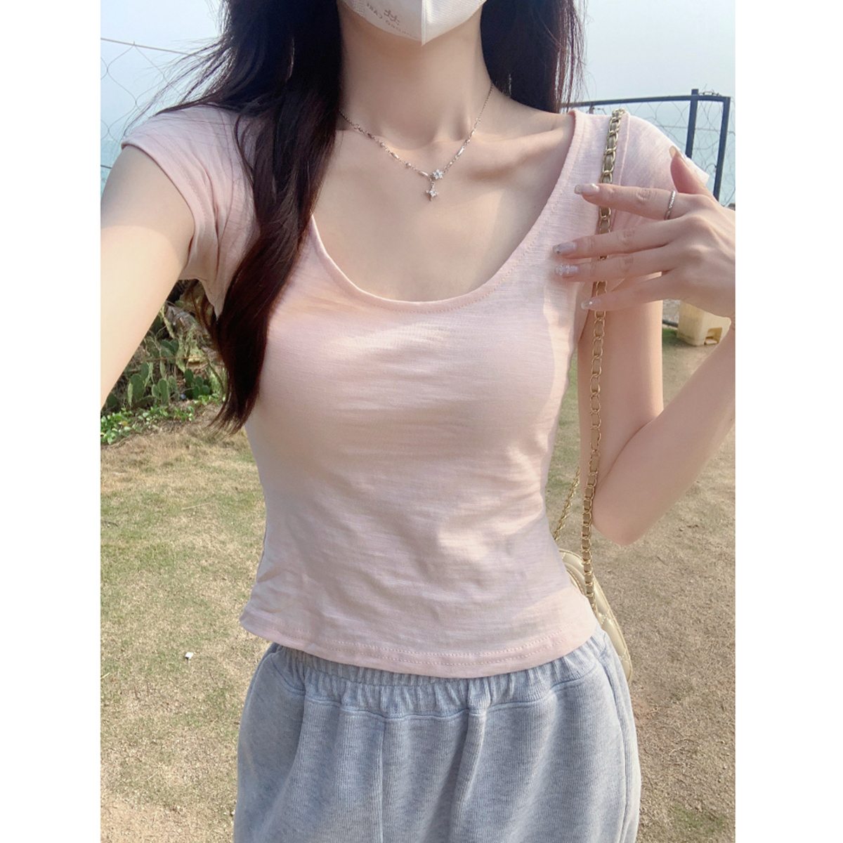 낮음 u 칼라 긍정적 인 어깨 핑크색 반팔 티셔츠 여성 여름 달콤한 매운맛 순수한 욕망 바람 외국 가스 몸매 가꾸기 슬림해 보이는 만나는 작은 셔츠 맨위