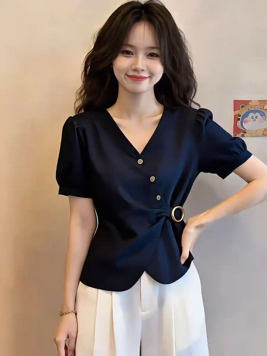 작은 대중 디자인 센스 V넥 허리 수축 반팔 여성 셔츠 2026 여름 새로운 한 부서 레트로 품격 다용도 맨위