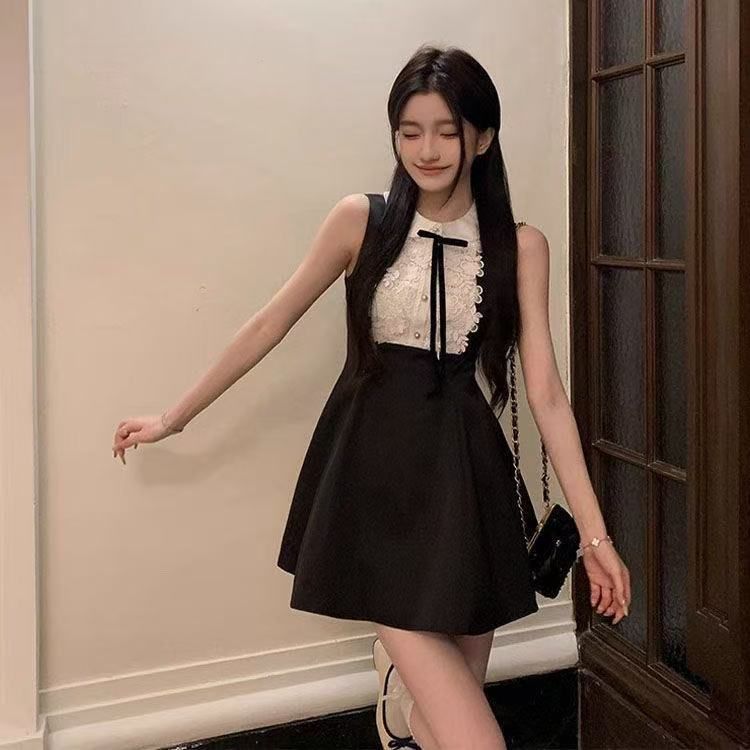 부유 한 가족 천 골드 고급 센스 검정색 민소매 조끼 원피스 여름 레이스 디자인 센스 허리 수축 한 마디 퍼프 스커트