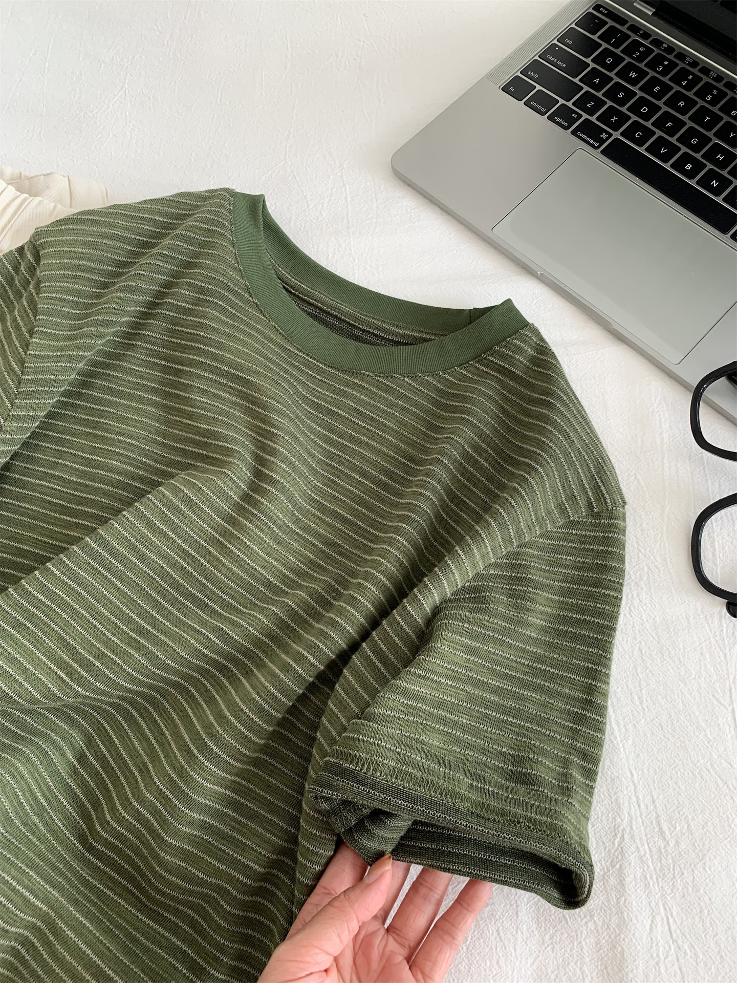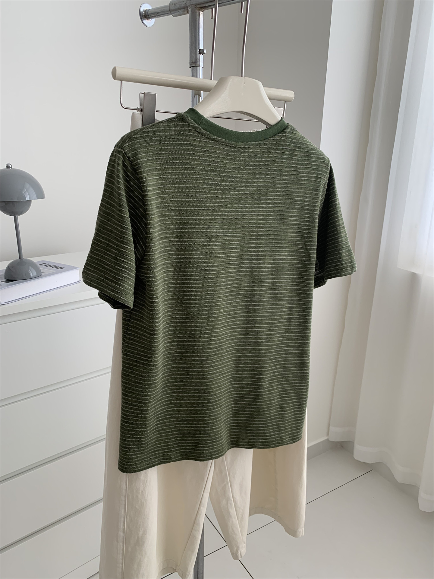 경관 그림 정가 디스플레이 화이트 레트로 짙은 녹색 자카드 스트라이프 반팔 미니멀리즘 한국 스타일 슬림해 보이는 다용도 티셔츠 기본 셔츠