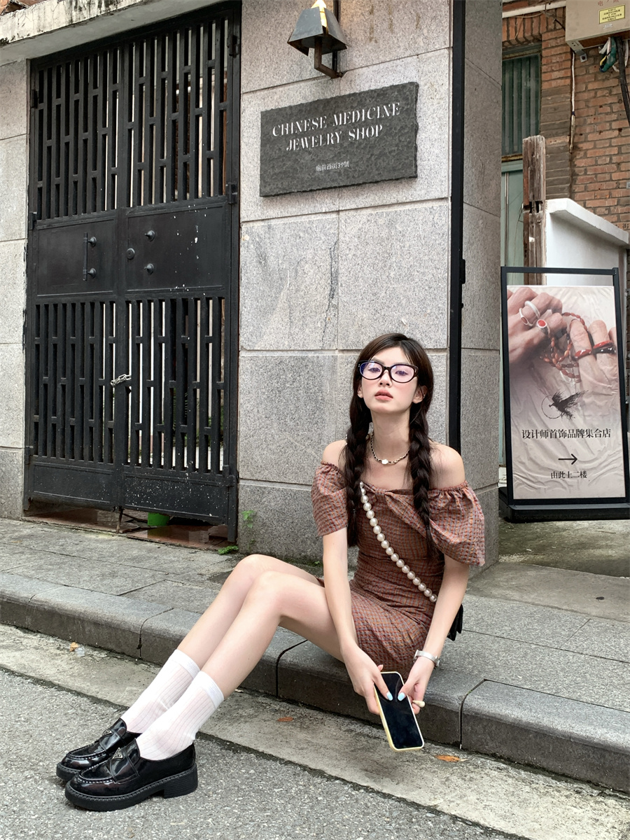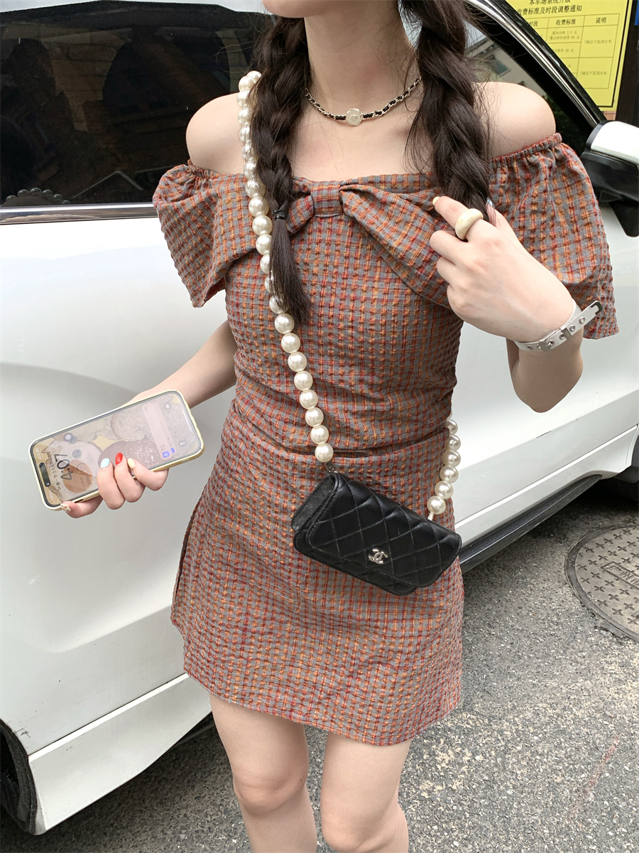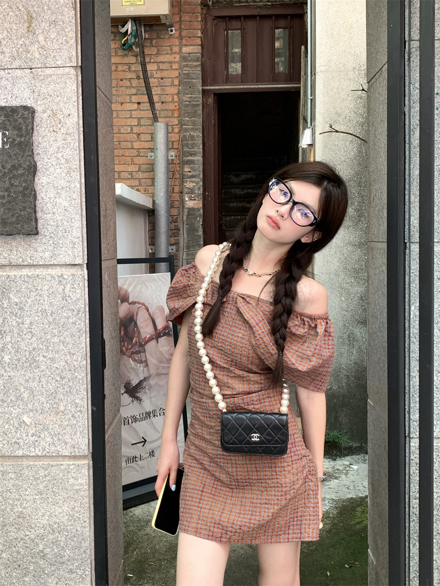 재고 있음 실사 순수한 욕망 레트로 스타일 공주 드레스 나비 매듭 오프숄더 둘 착용 연령 감소 체크무늬 미니 스커트 드레스