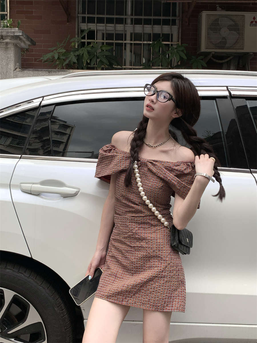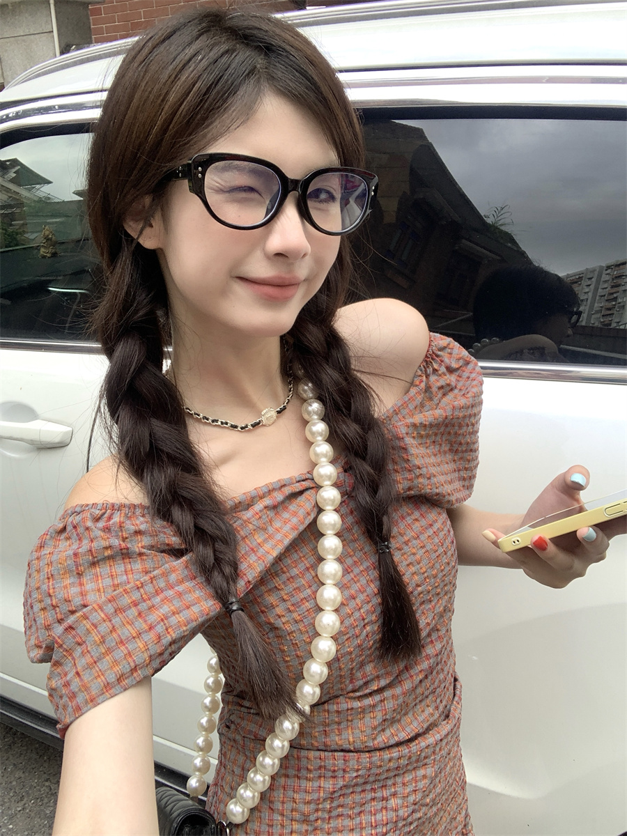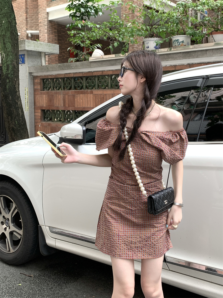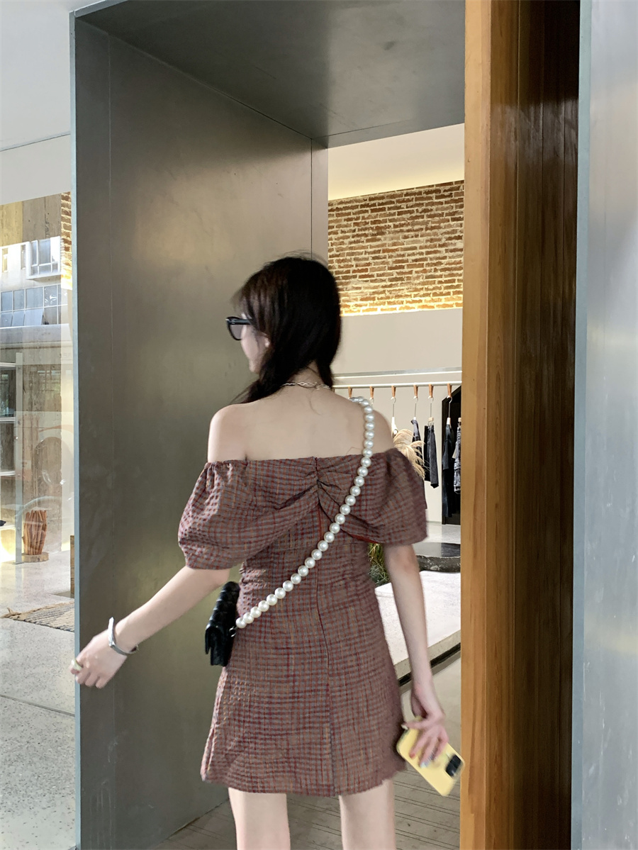 재고 있음 실사 순수한 욕망 레트로 스타일 공주 드레스 나비 매듭 오프숄더 둘 착용 연령 감소 체크무늬 미니 스커트 드레스