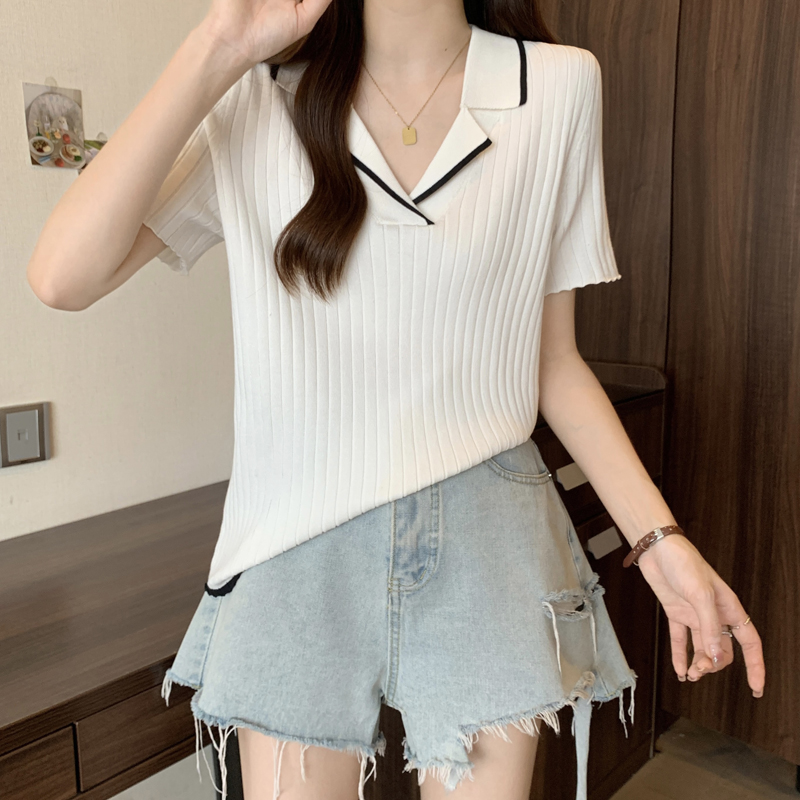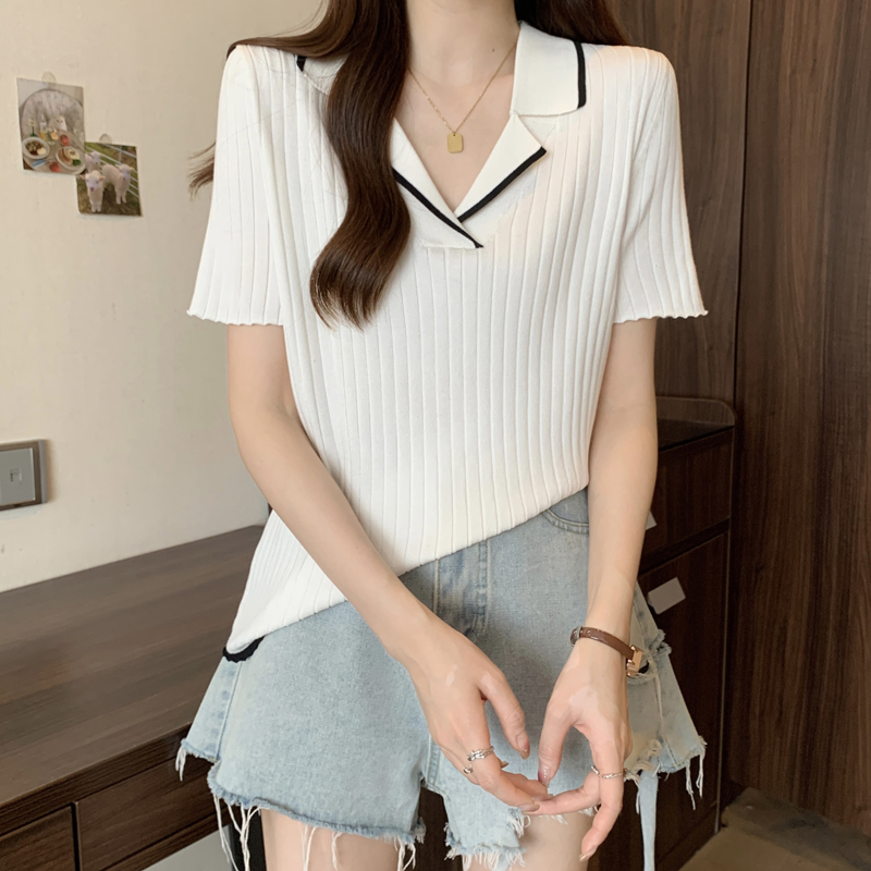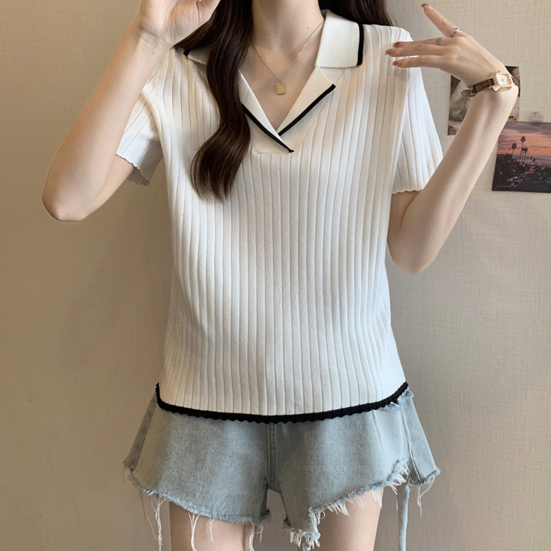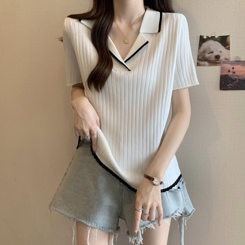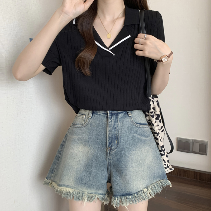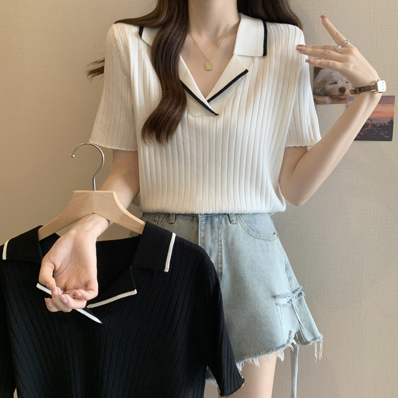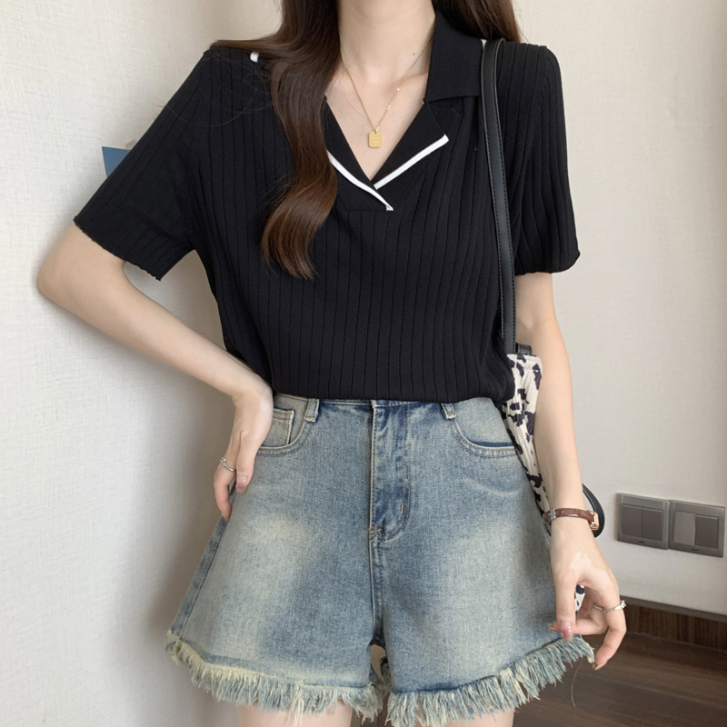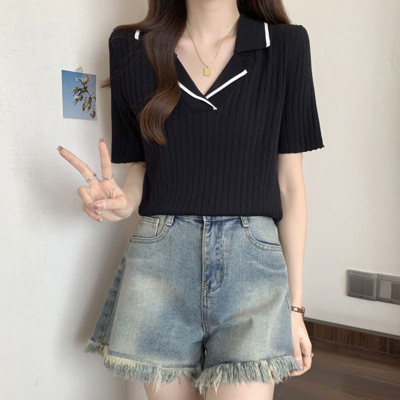 한 부서 비즈 박기 검정색 u 칼라 긍정적 인 어깨 니트 반팔 티셔츠 여성 얇은 스타일 인사이드 가져 가라. 외국 가스 고유 한 아름다운 초여름 맨위