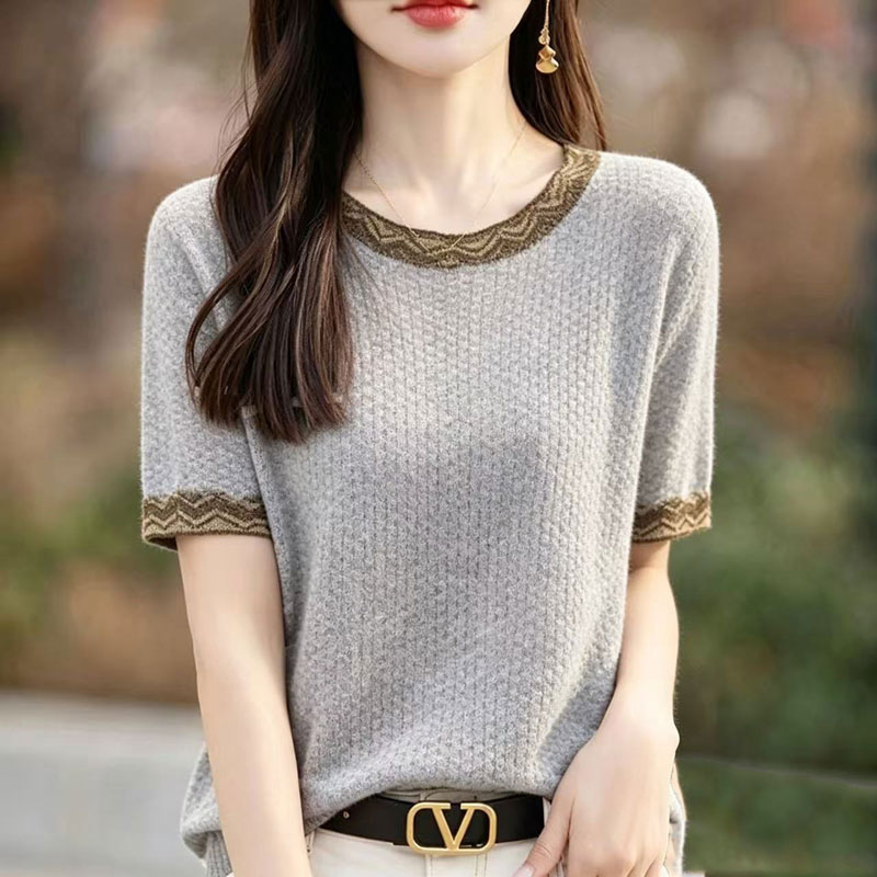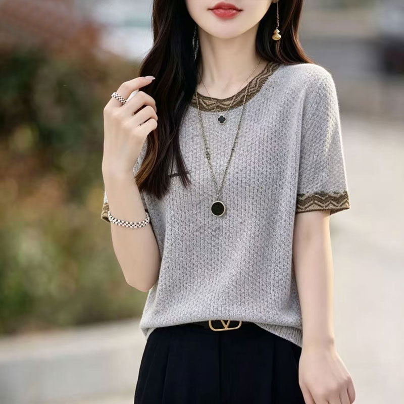 여름 새로운 고급 얼음 실크 티셔츠 여성 루즈핏 라운드 넥 맨위 패션 다용도 니트 스웨터 반팔 엄마 표지 고기