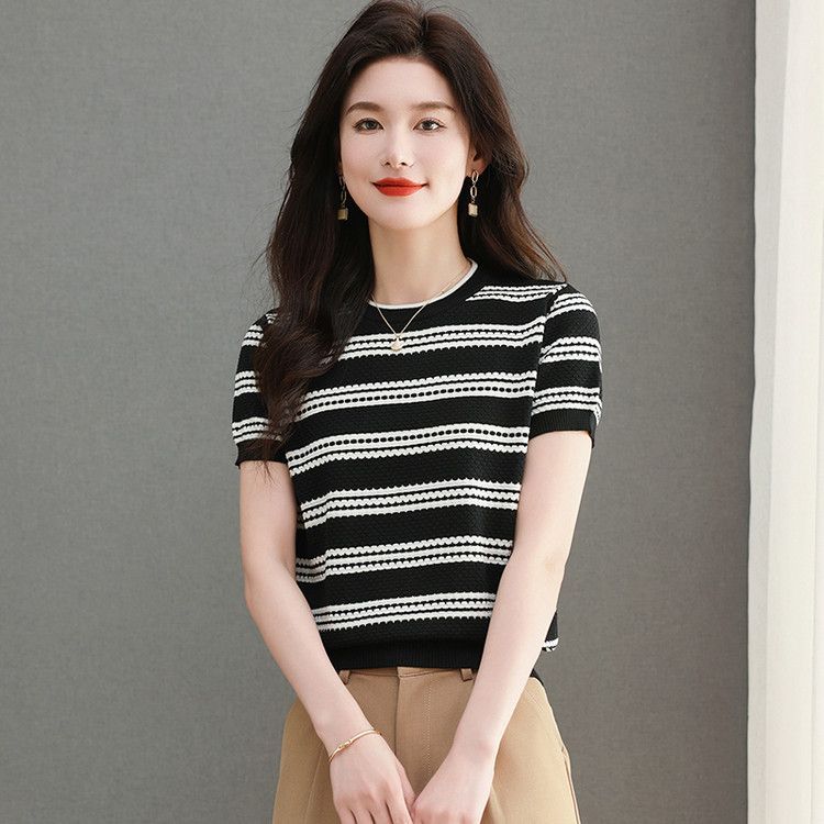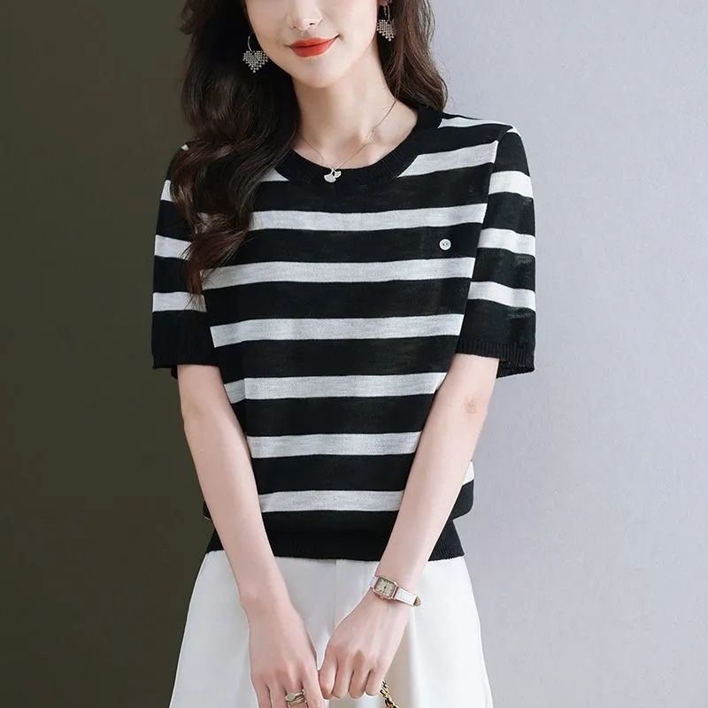 여름 새로운 라운드 넥 패션 다용도 빅 사이즈 반팔 스트라이프 품격 니트 스웨터 티셔츠 쇼트 스타일 얼음 실크 맨위 여성