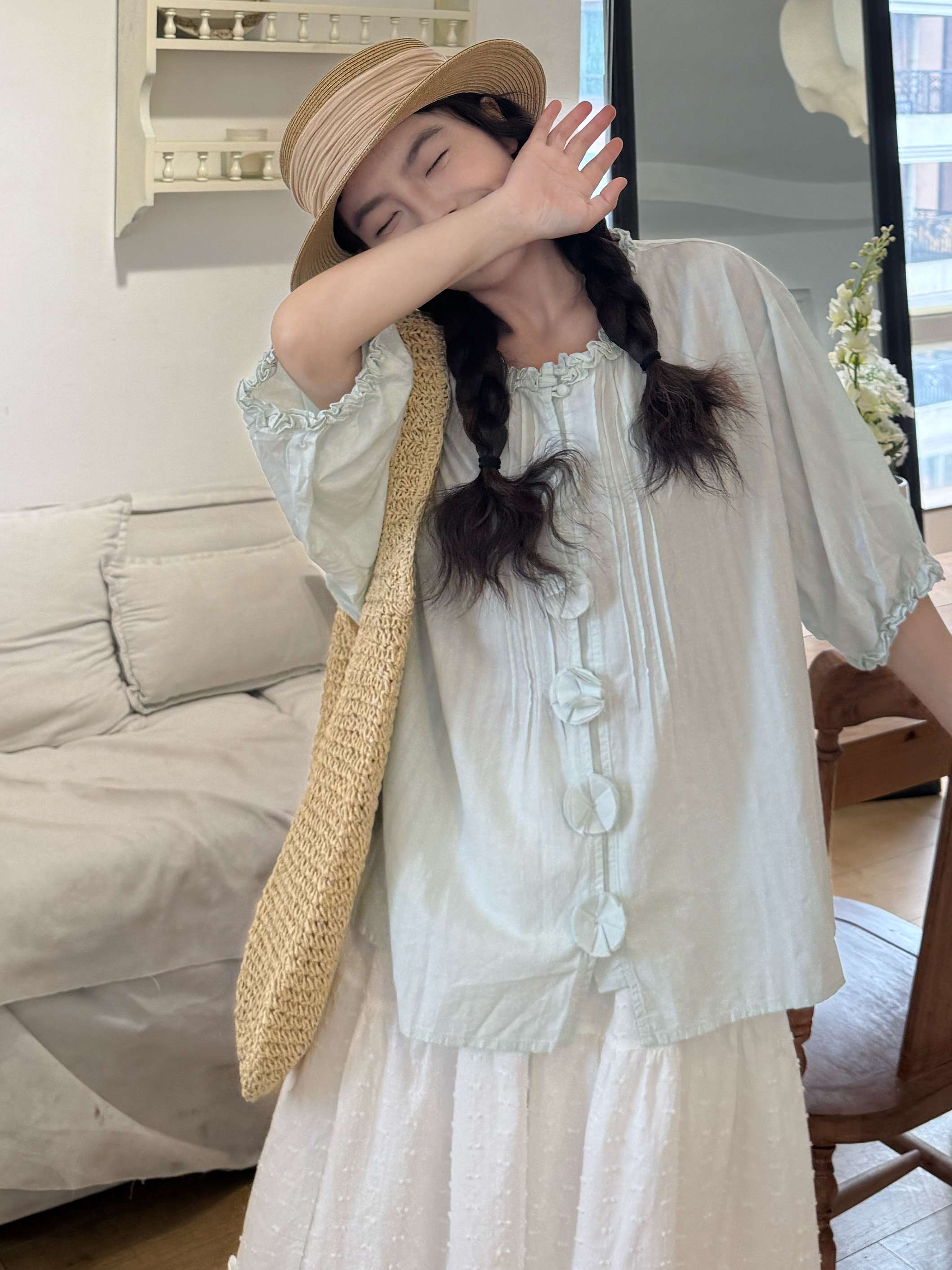 실사 나비 매듭 반팔 맨위 여성 여름 새로운 디자인 센스 작은 대중 프랑스식 셔츠