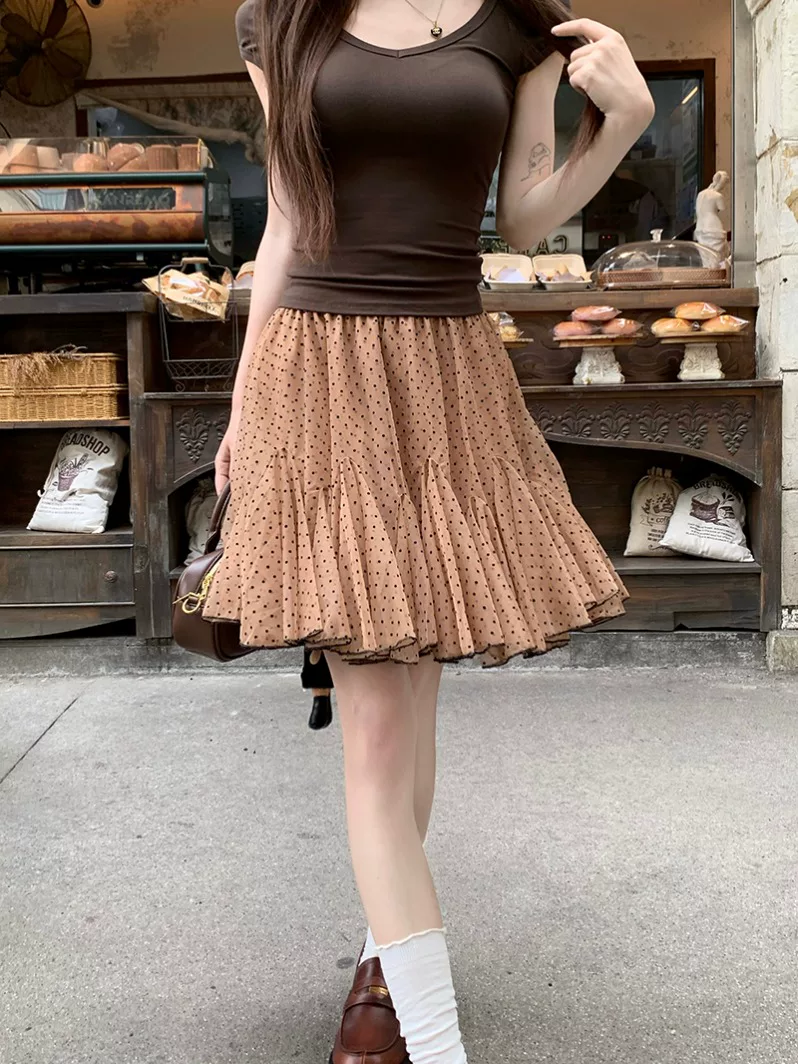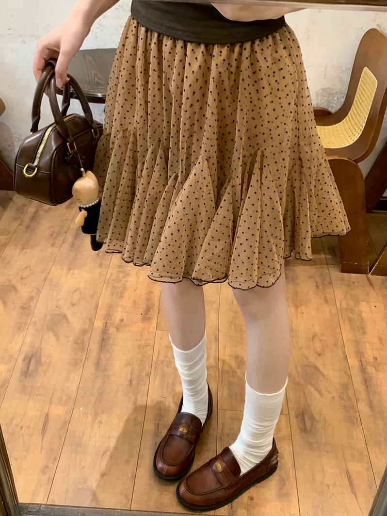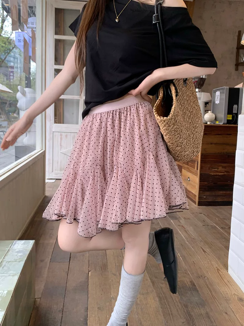 2026 한 부서 핑크색 도트 무늬 반신 스커트 여성 망사 A라인 스커트 퍼프 스커트 여름