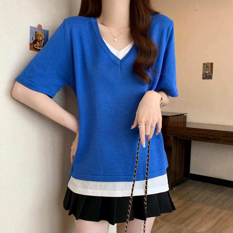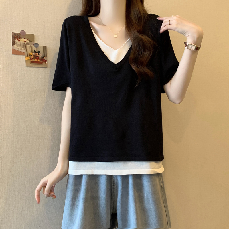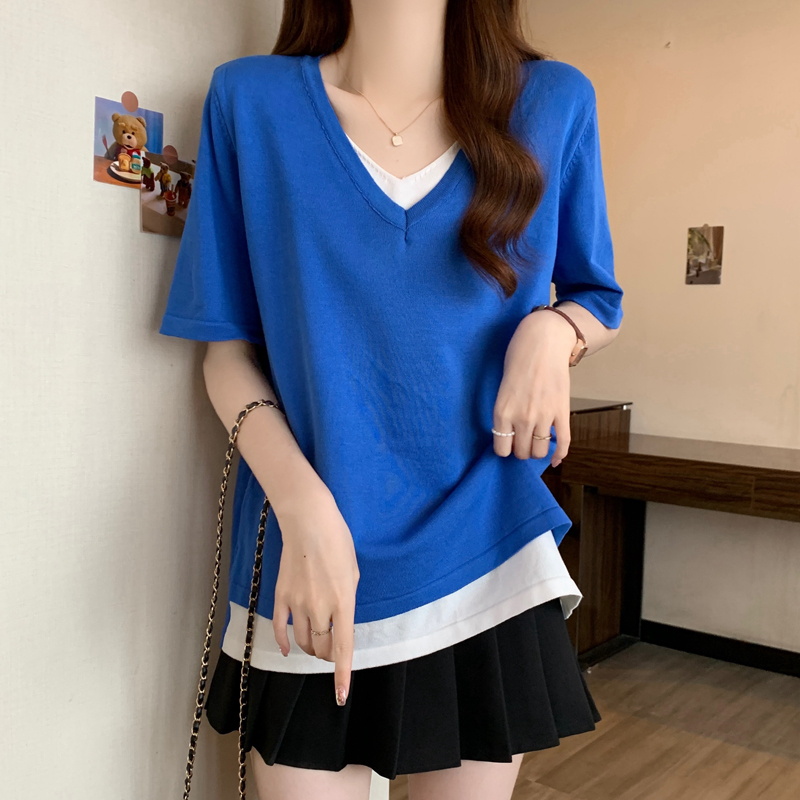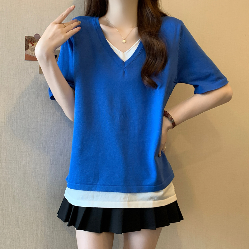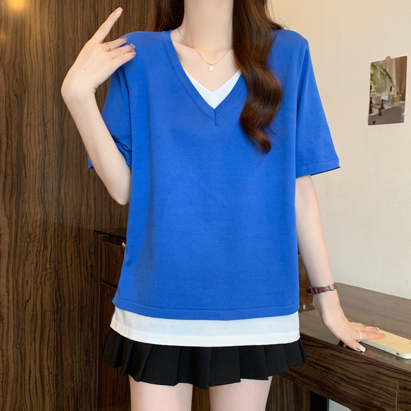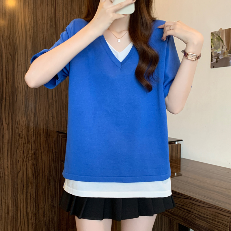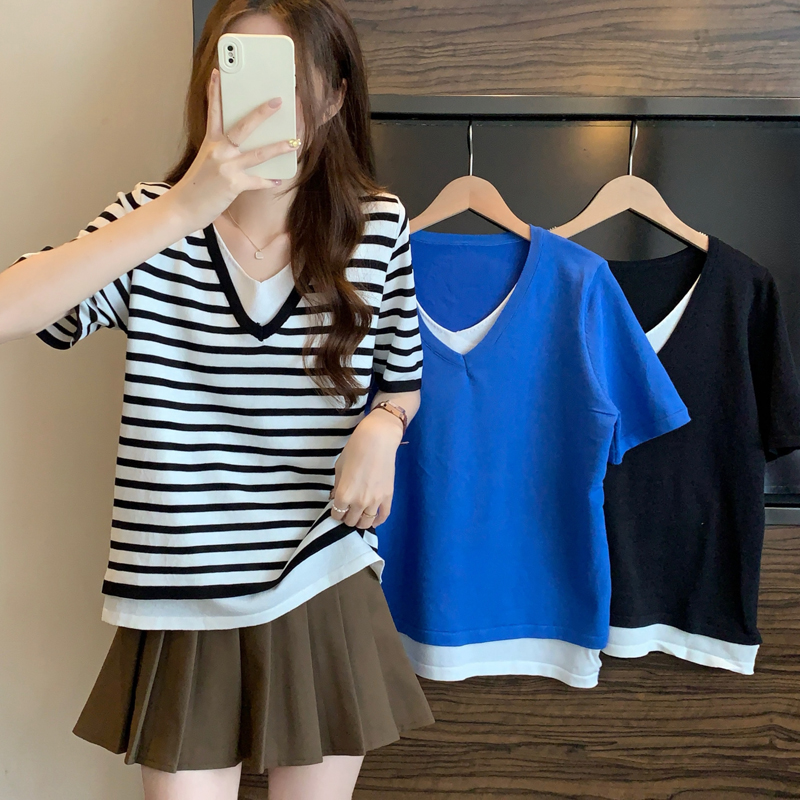 실사 2026 년 빅 사이즈 여성 의류 여름 새로운 페이크 레이어드 통통한 여동생 200 kg 니트 맨위 지방 mm 티셔츠
