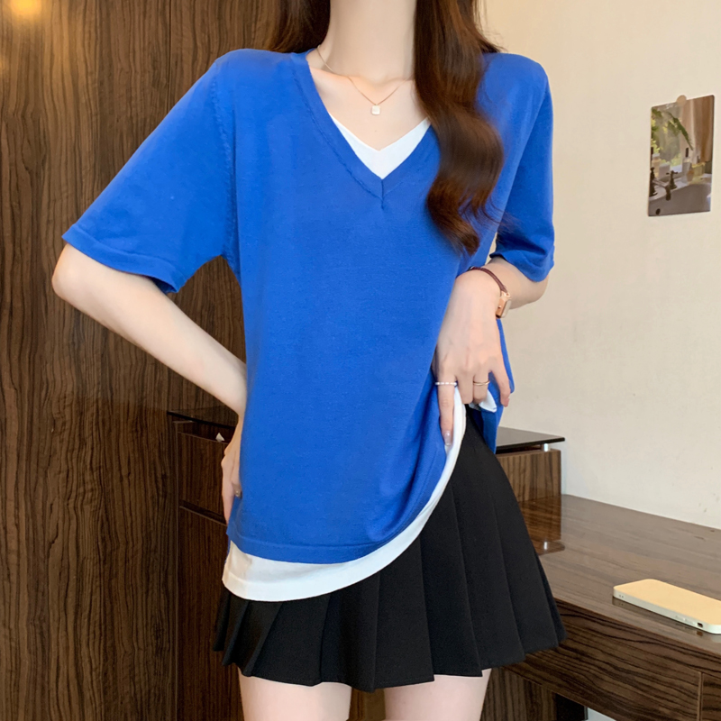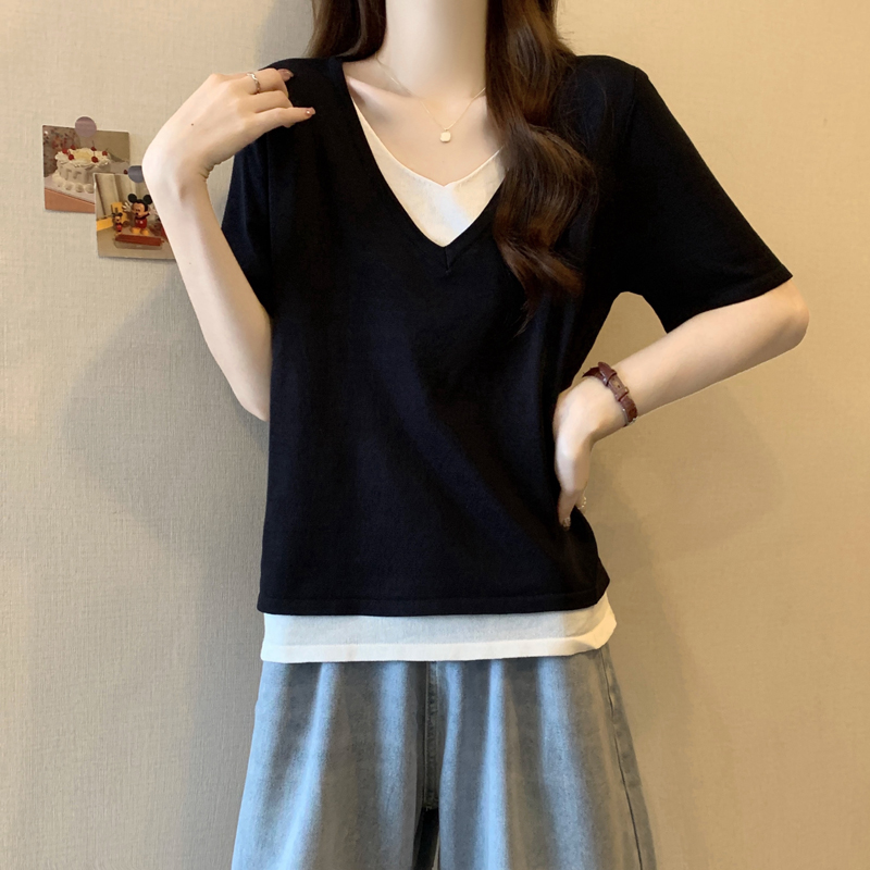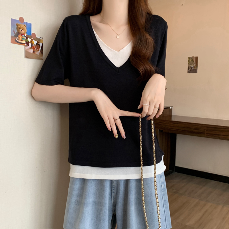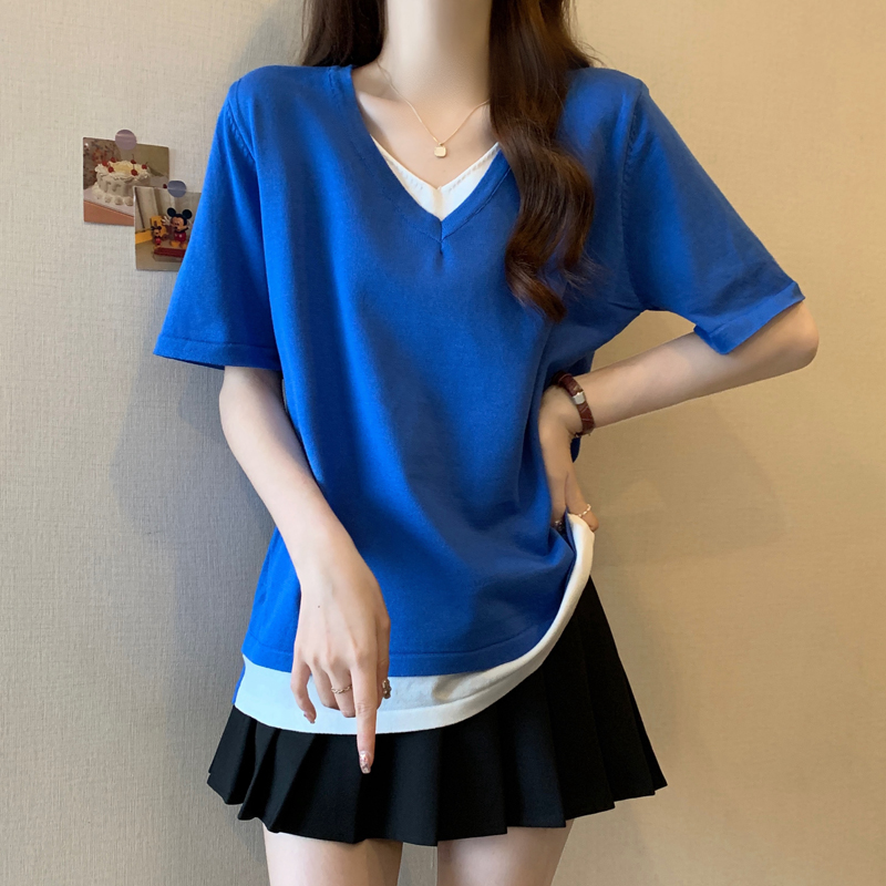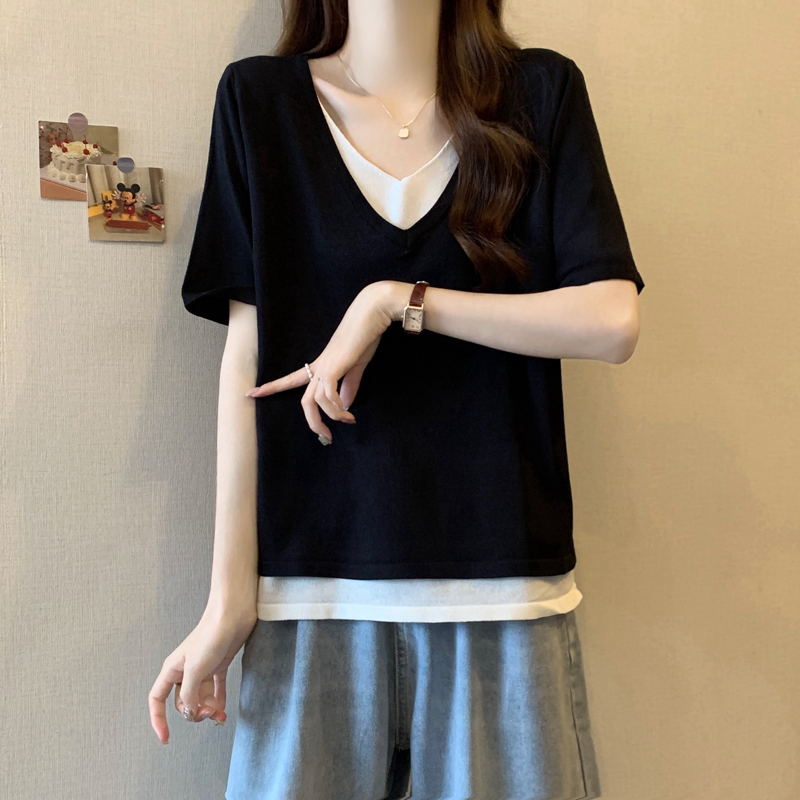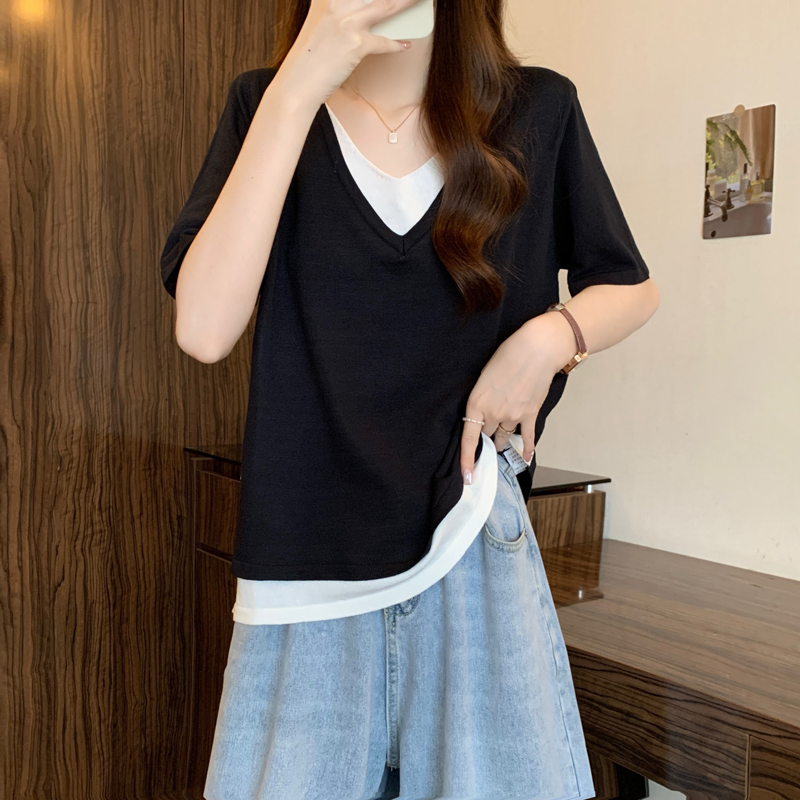 실사 2026 년 빅 사이즈 여성 의류 여름 새로운 페이크 레이어드 통통한 여동생 200 kg 니트 맨위 지방 mm 티셔츠