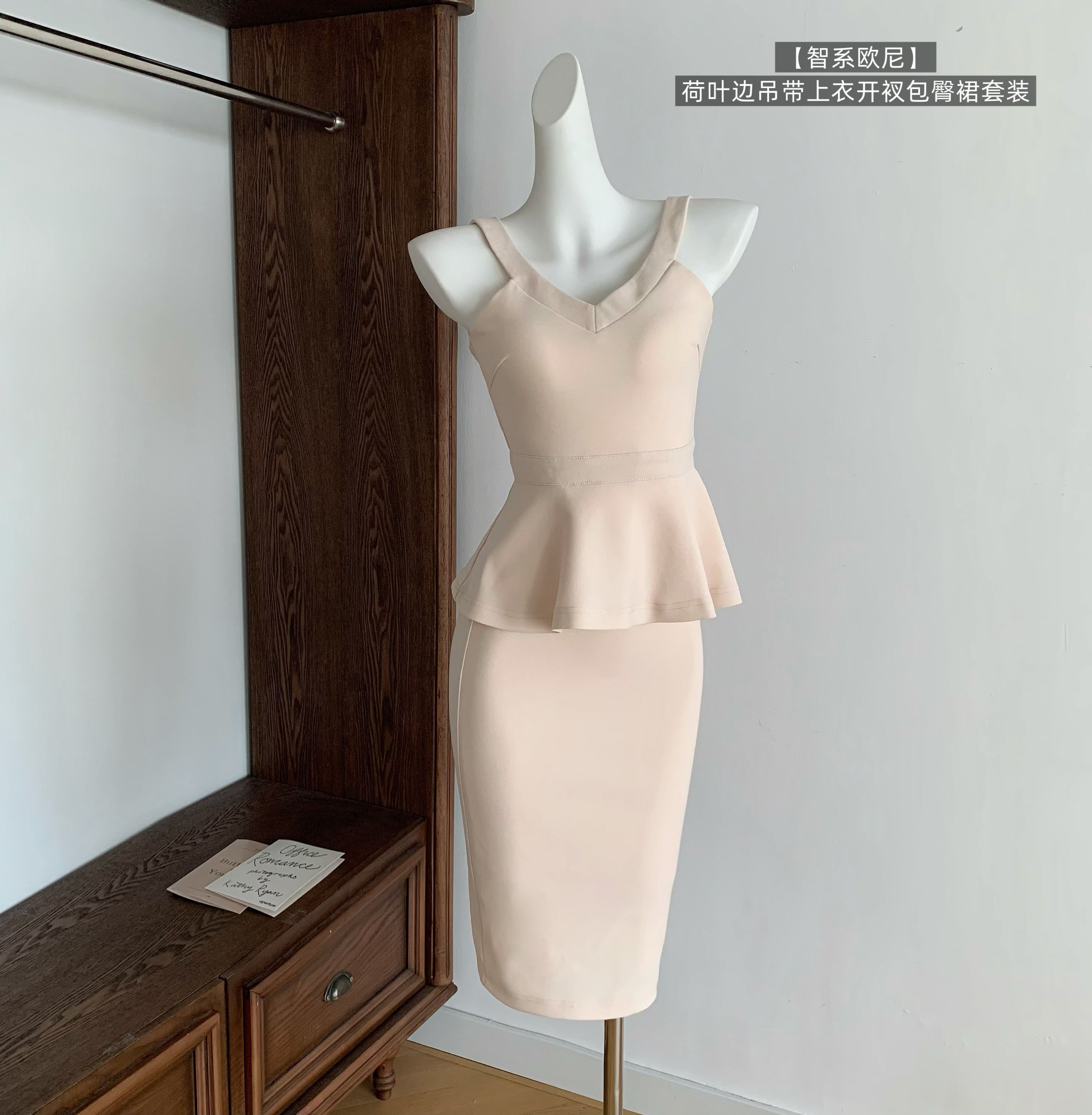 cher 챠오어 지혜 부서 유럽 니켈 프릴 슬립 맨위 트임 타이트 스커트 반신 치마 세트 여성 여름