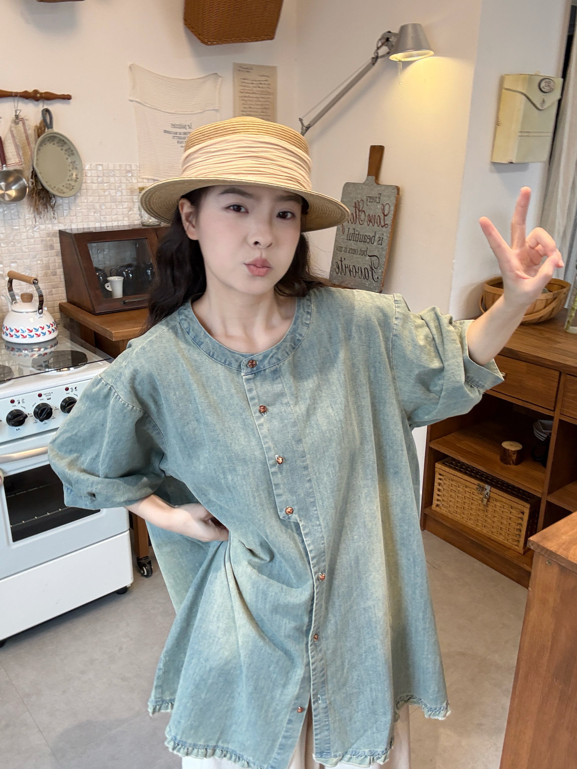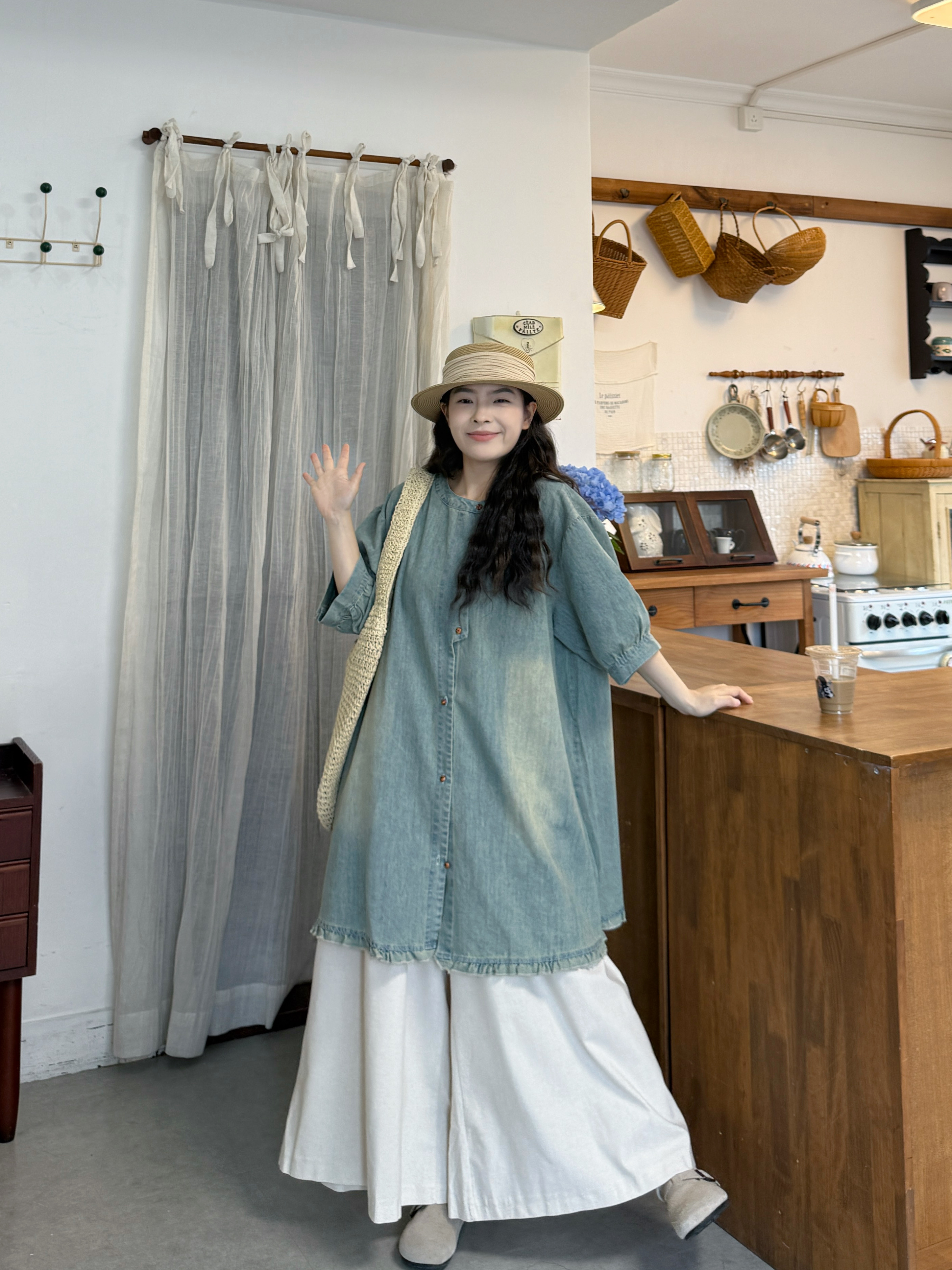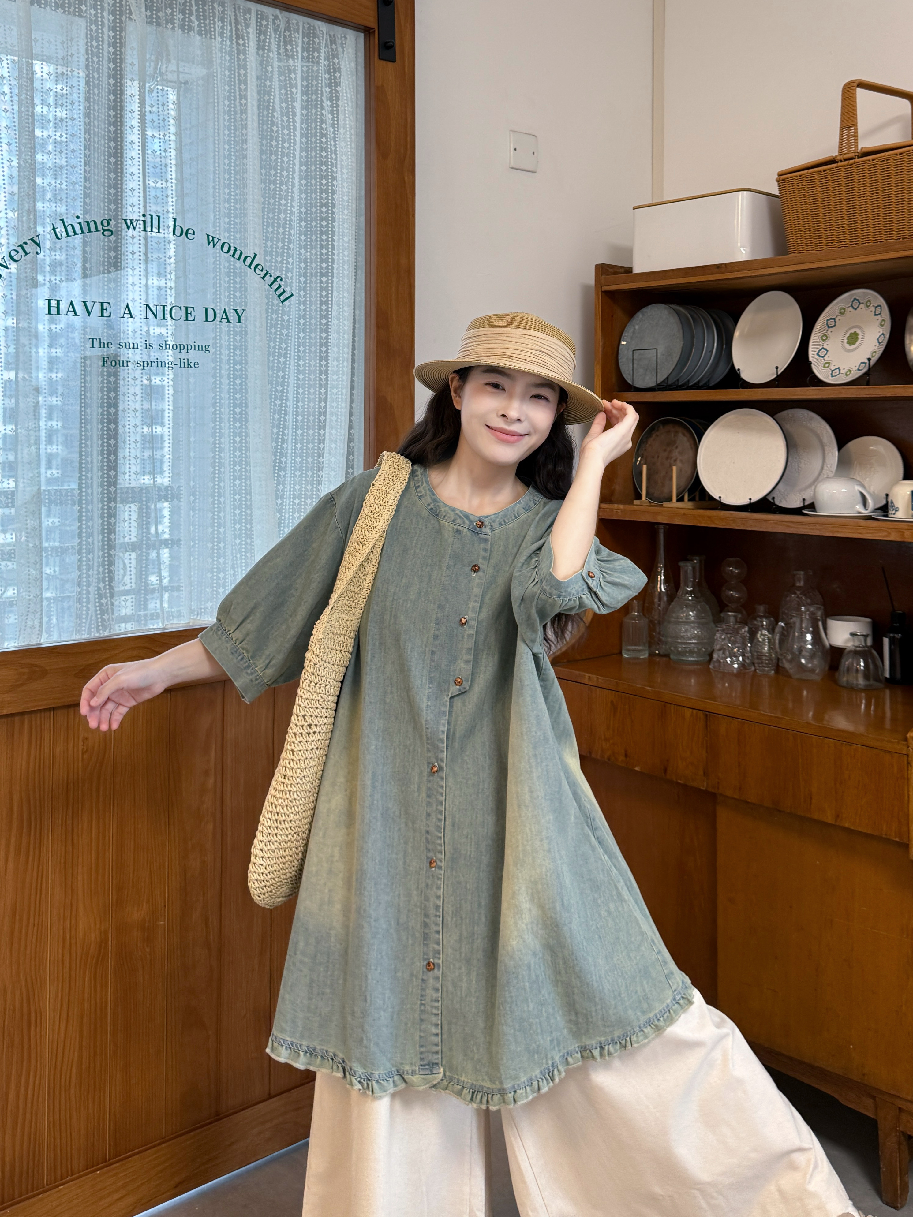 실사 데님 레이스 워싱 레트로 푸른 소 애버딘 여성 코트 라운드 넥 중간 길이 면 린넨 바지