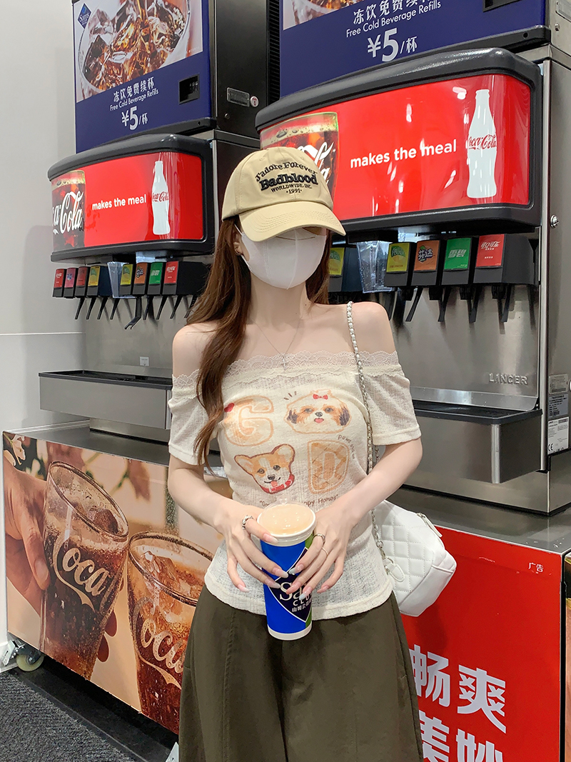 실사 정가 여름 한국 스타일 순수한 욕망 페이크 레이어드 레이스 조각 비스듬한 어깨 불규칙 오프숄더 반팔 티셔츠 맨위