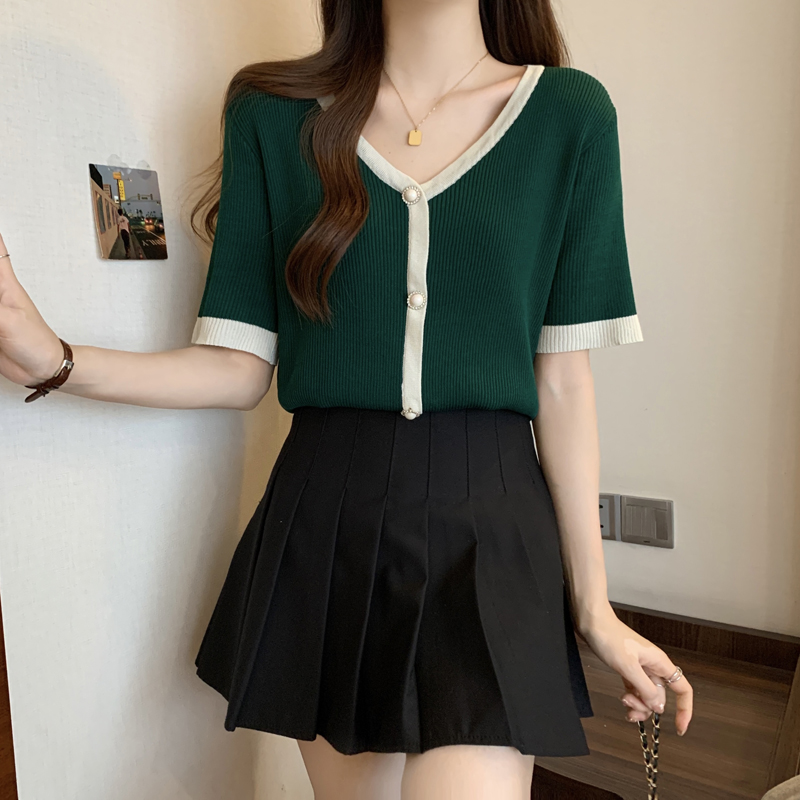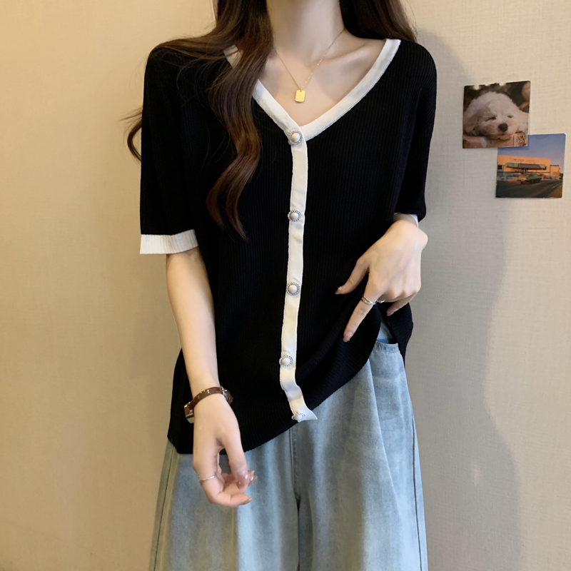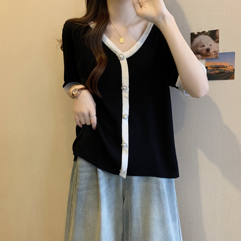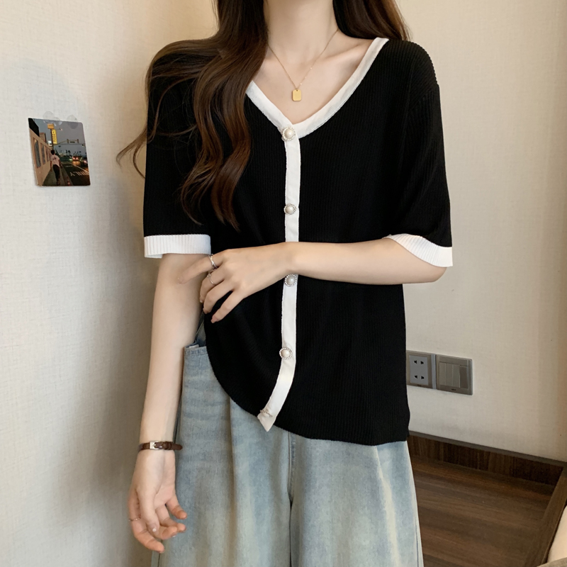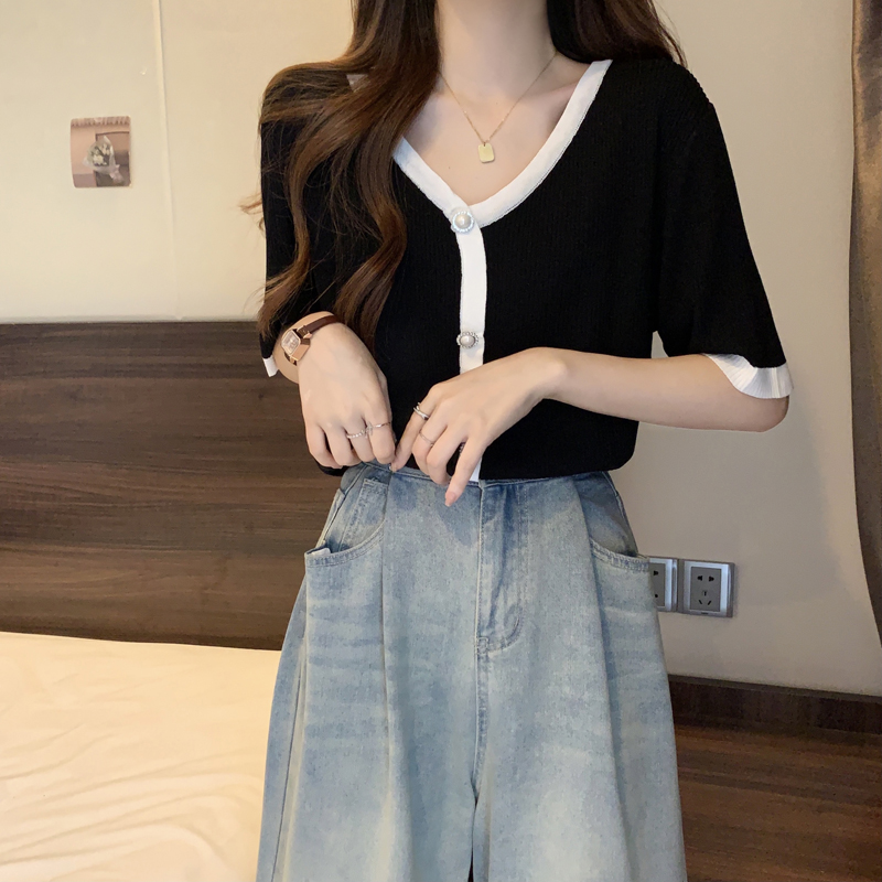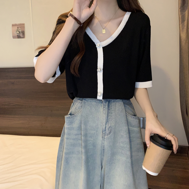 한 부서 빛 요리 한 바람 복잡한 고대 칼라 홀로우 아웃 반팔 니트 스웨터 여성 여름 새로운 몸매 가꾸기 슬림해 보이는 외국 가스 맨위 트렌디