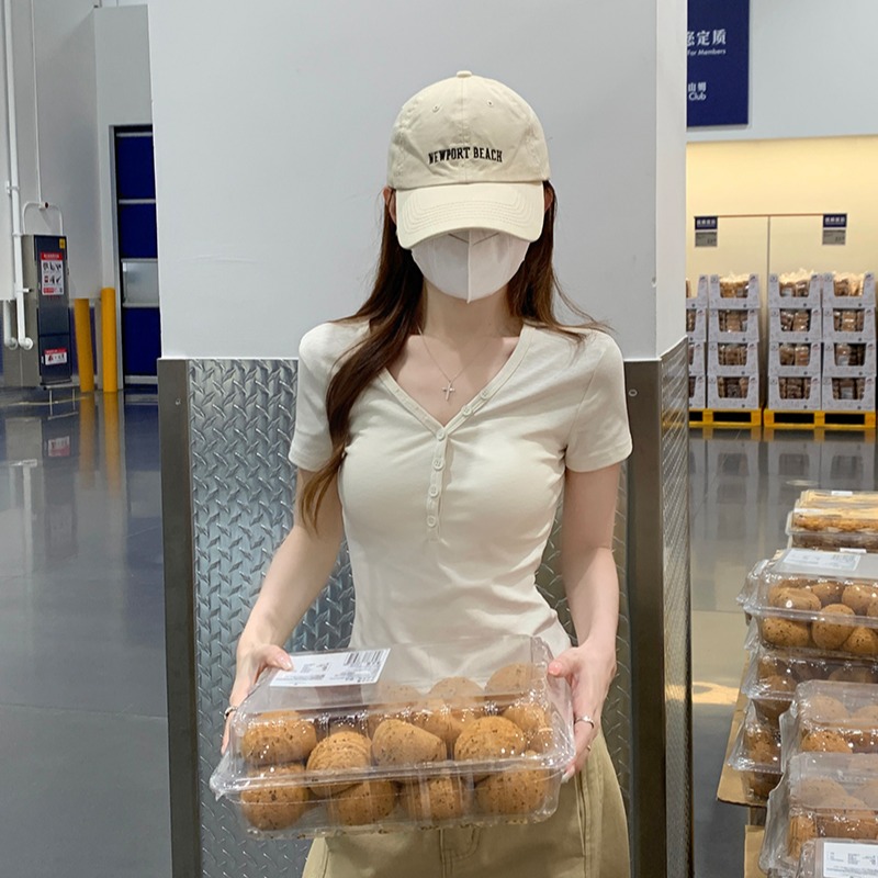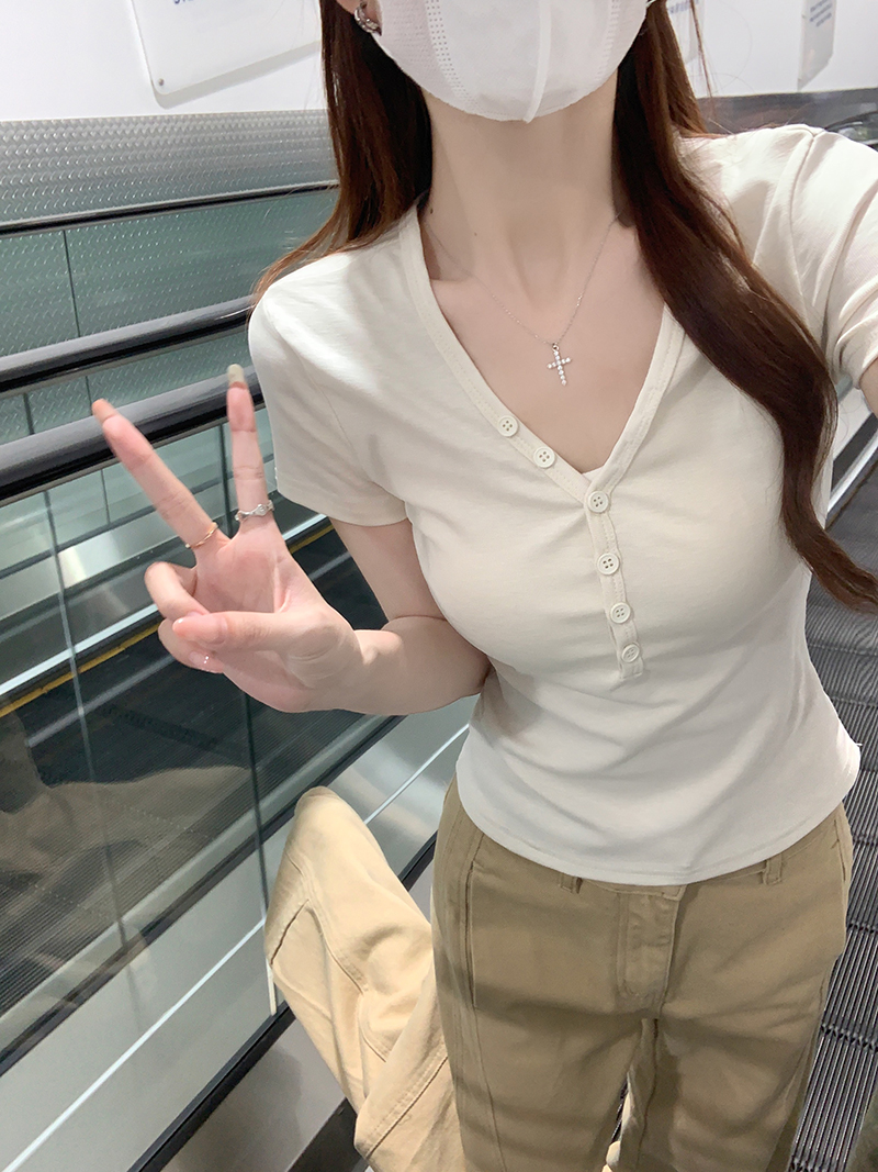 한국 반팔 티셔츠 여성 여름 새로운 디자인 센스 단추 한 부서 긍정적 인 어깨 슬림해 보이는 V넥 맨위