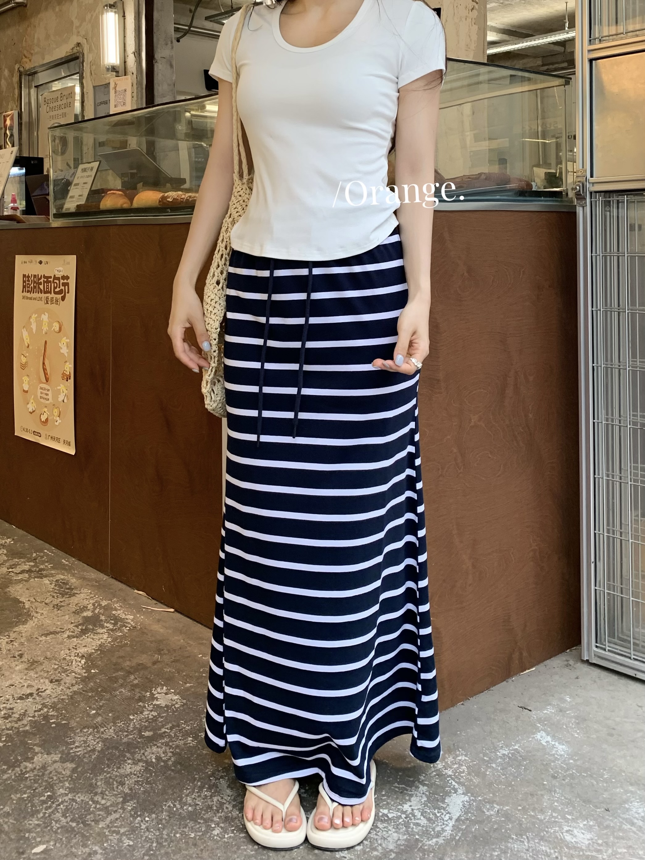 실사 정가 스트라이프 반신 스커트 스트라이프 롱 코트 펌프 로프 트임 반신 스커트