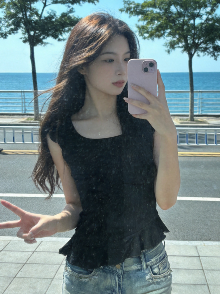 실사 홀로우 아웃 베스트 불규칙 밑단 반팔 티셔츠 청바지