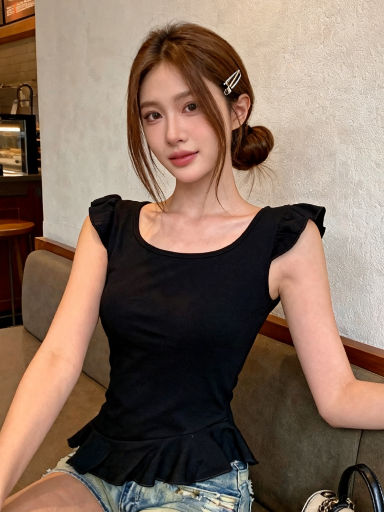 프랑스식 숙녀 바람 Feifei 소매 u 칼라 반팔 티셔츠 2026 년 여름 새로운 부드러운 슈퍼 잘 생긴 Chic 맨위