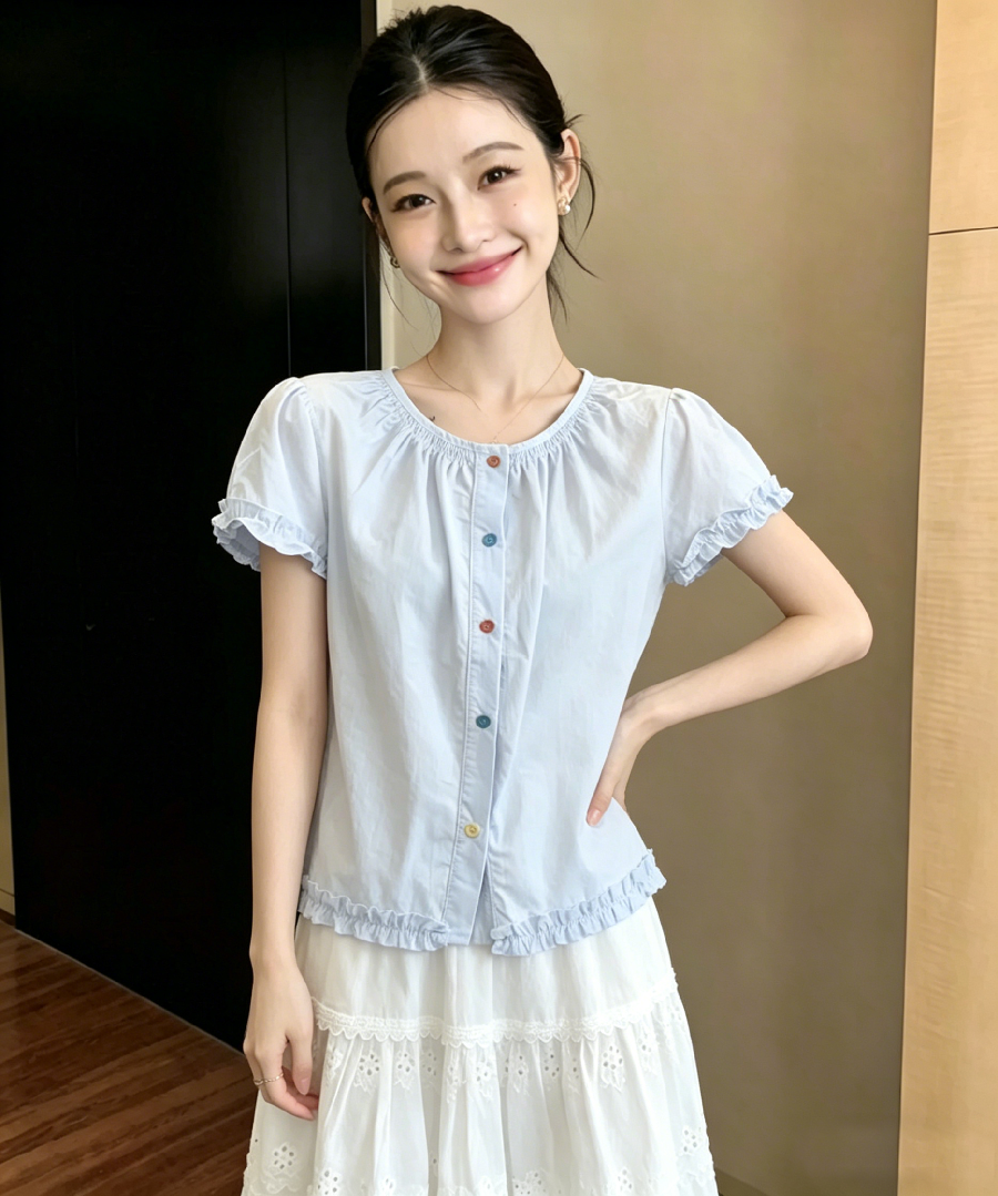 2026 여름 새로운 새로운 한 부서 라운드 넥 색상 버클 프릴 연령 감소 루즈핏 다용도 반팔 셔츠 맨위