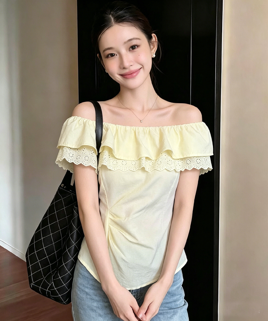 2026 여름 드레스 새로운 프랑스식 순수한 욕망 오프숄더 프릴 반팔 티셔츠 여성 오프숄더 인형 맨위
