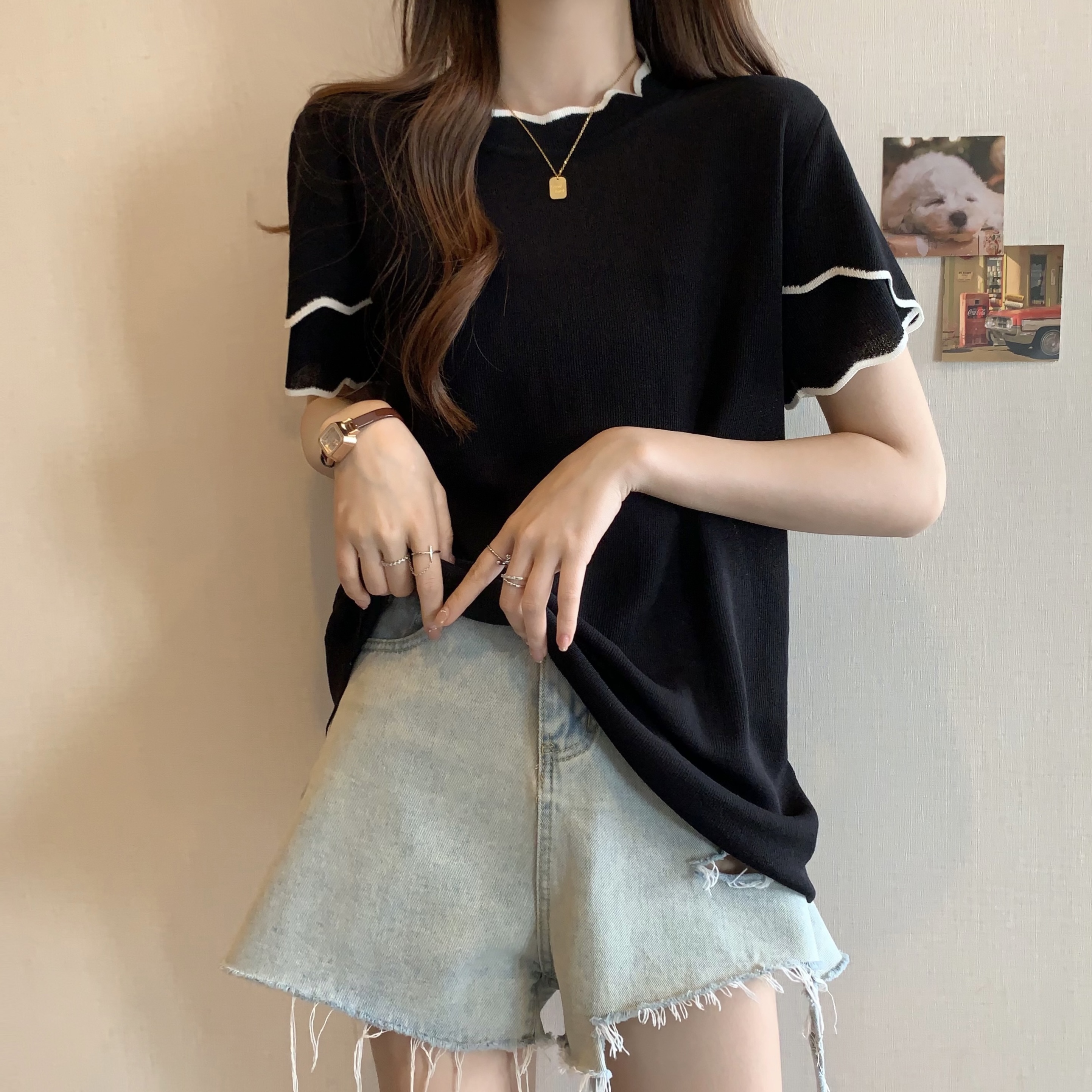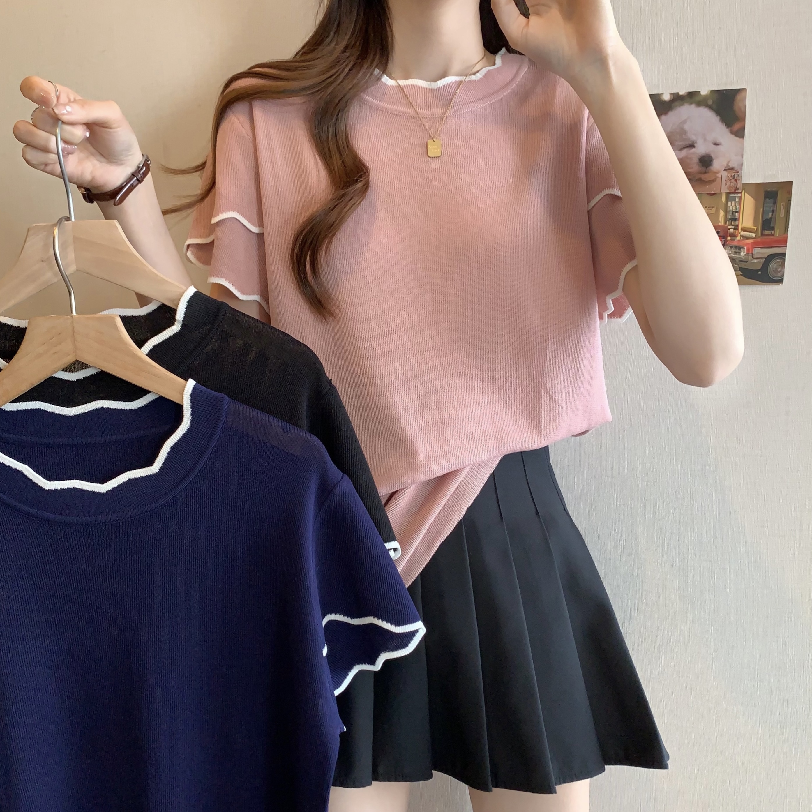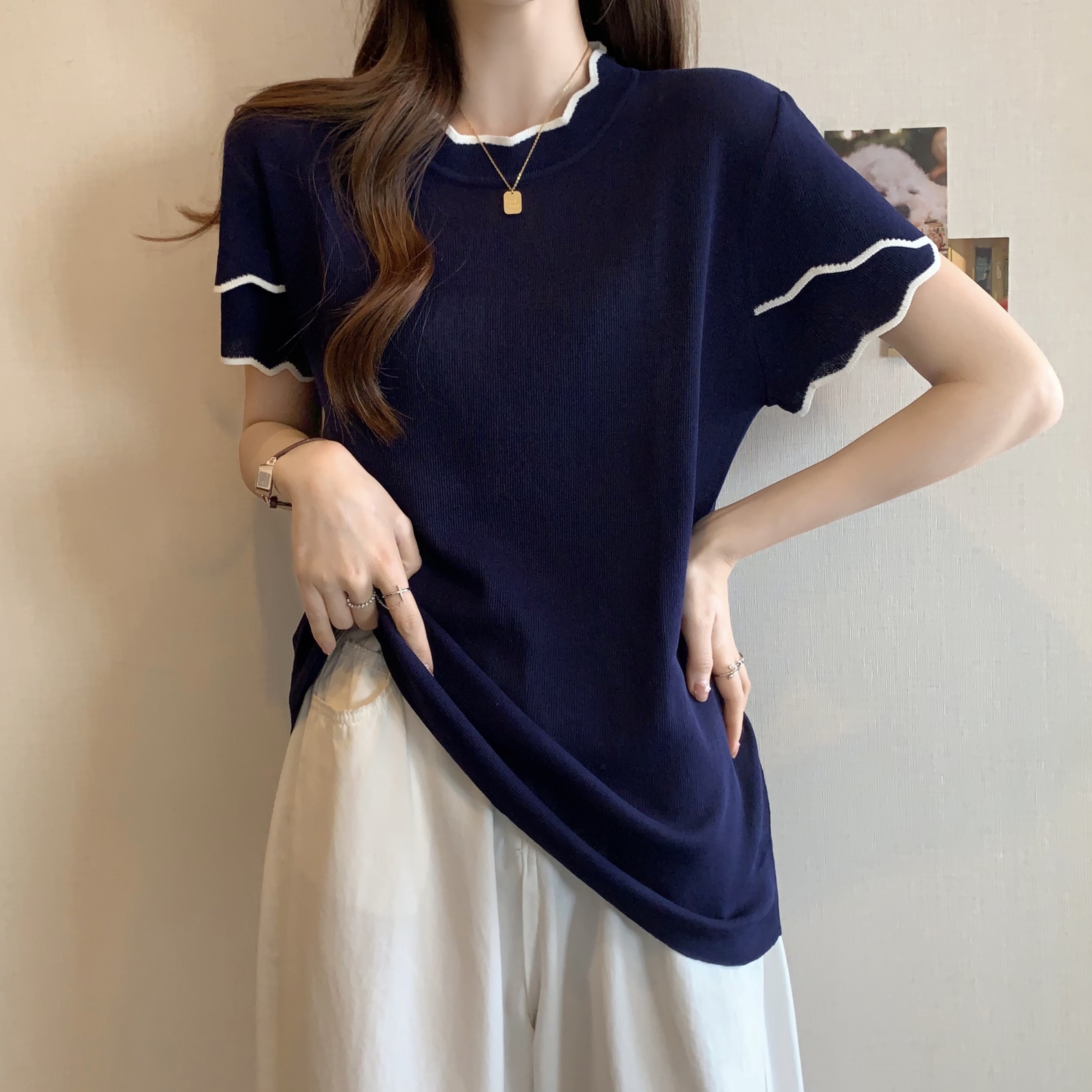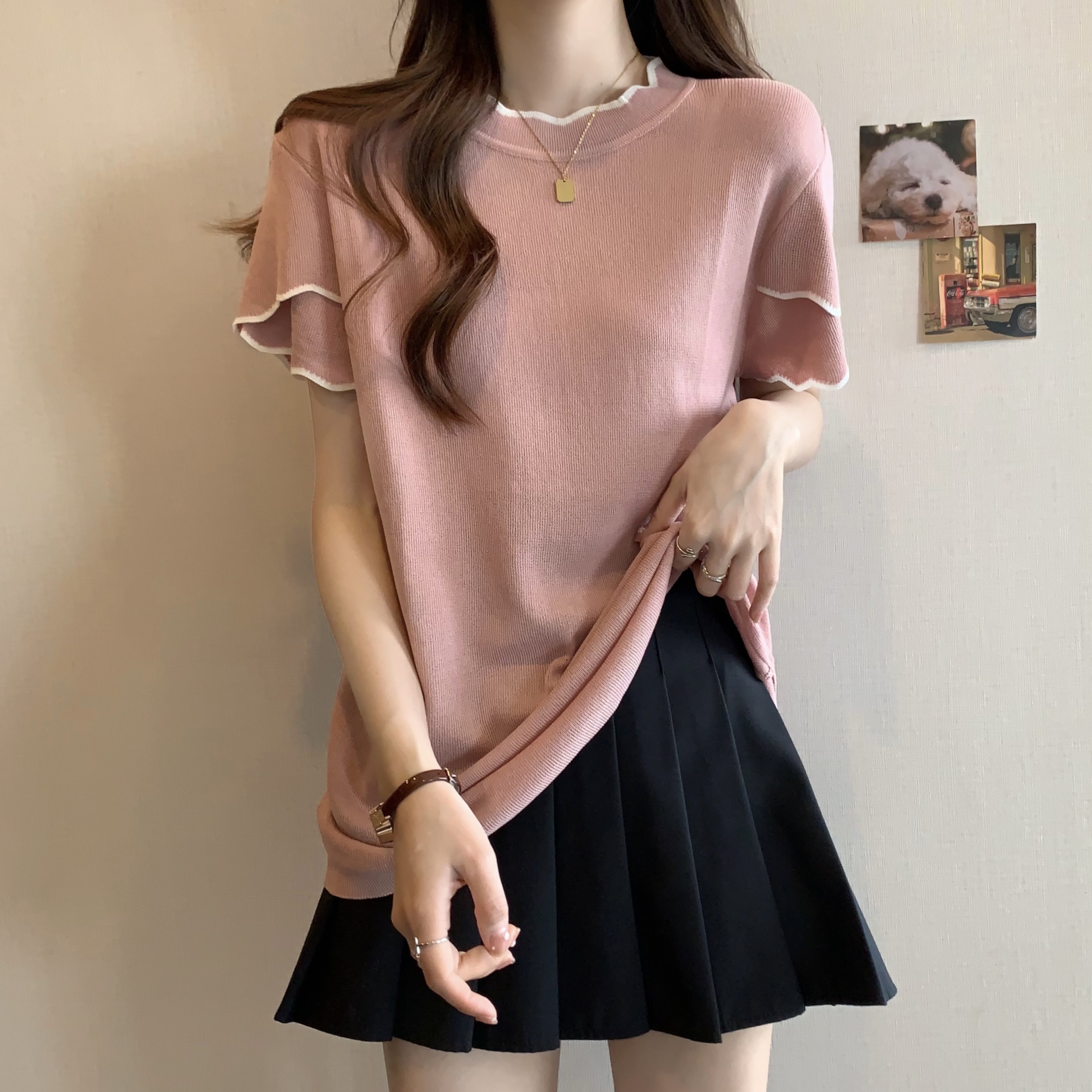 실사 2026 년 빅 사이즈 여성 의류 여름 새로운 지방 mm 반소매 라운드 넥 니트 맨위 통통한 여동생 티셔츠