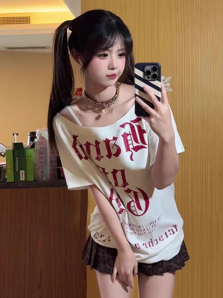 220 그램 92 면 8 암모니아 Lun 아메리칸 핫걸 비스듬한 어깨 알파벳 프린트 반팔 티셔츠 여성
