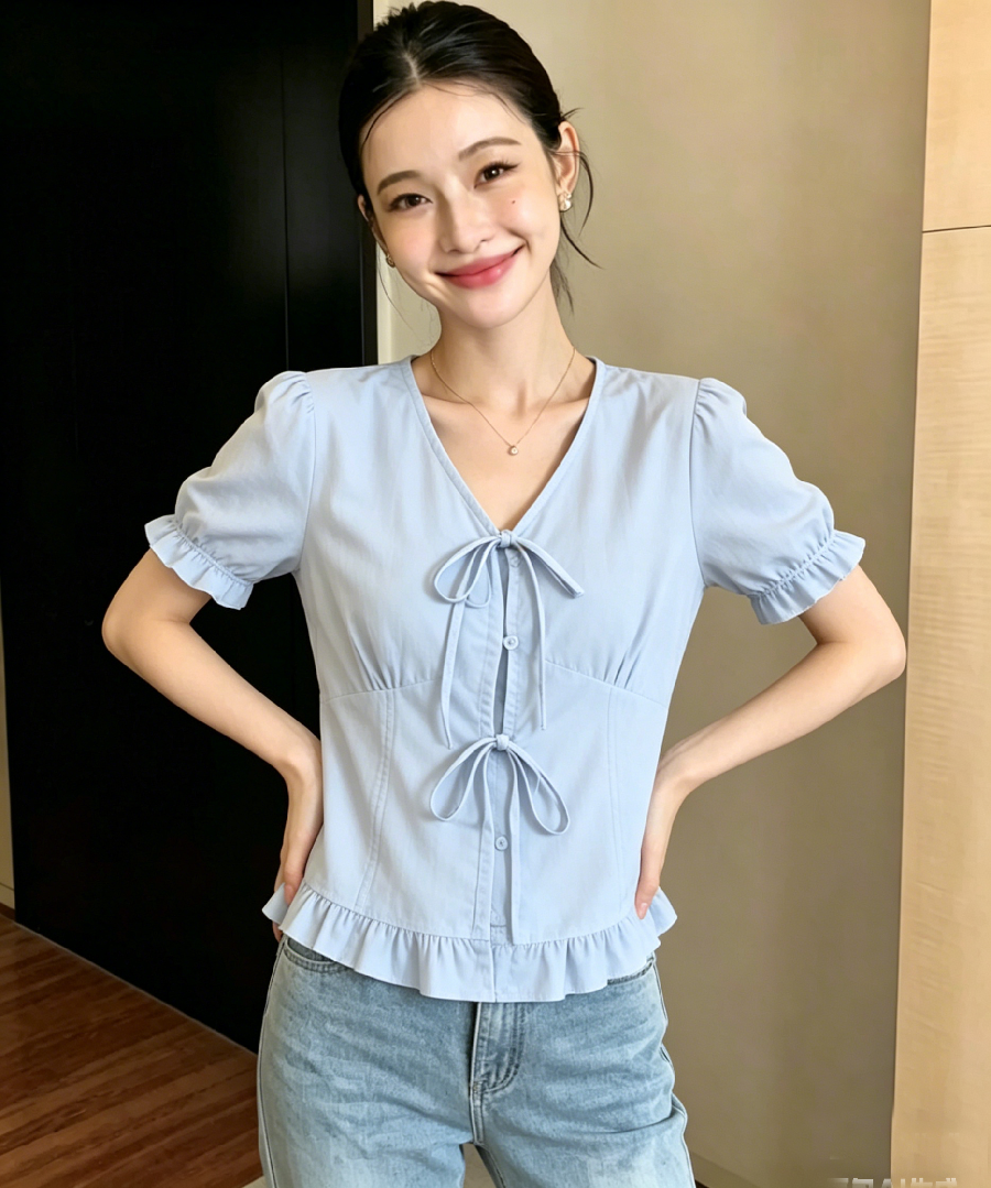 2026 여름 새로운 새로운 한 부서 라운드 넥 색상 버클 프릴 연령 감소 루즈핏 다용도 반팔 셔츠 맨위