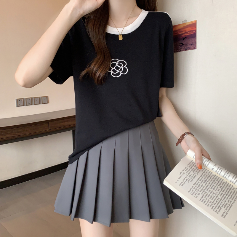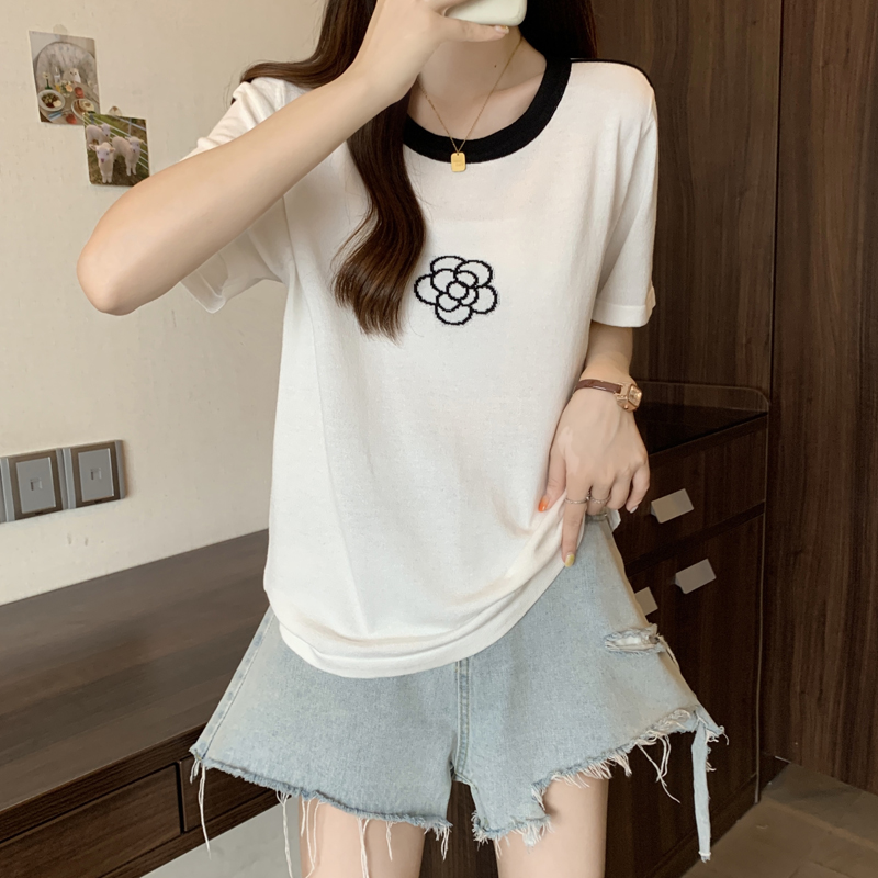 한국 고급 센스 반팔 티셔츠 여성 의류 여름 새로운 리본 나비 매듭 슬림해 보이는 라운드 넥 맨위