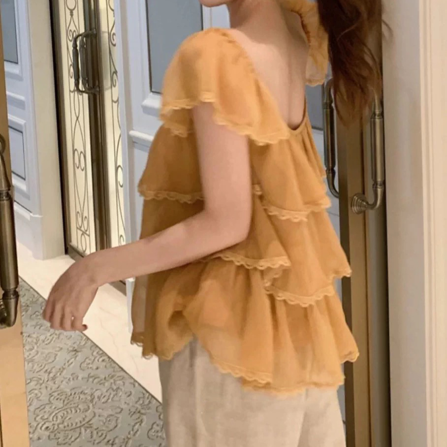 주문 재고 있음 프랑스식 달콤함 층 프릴 망사 캐미솔 배색 레이스 루즈핏 드 러 뒤쪽에 의류